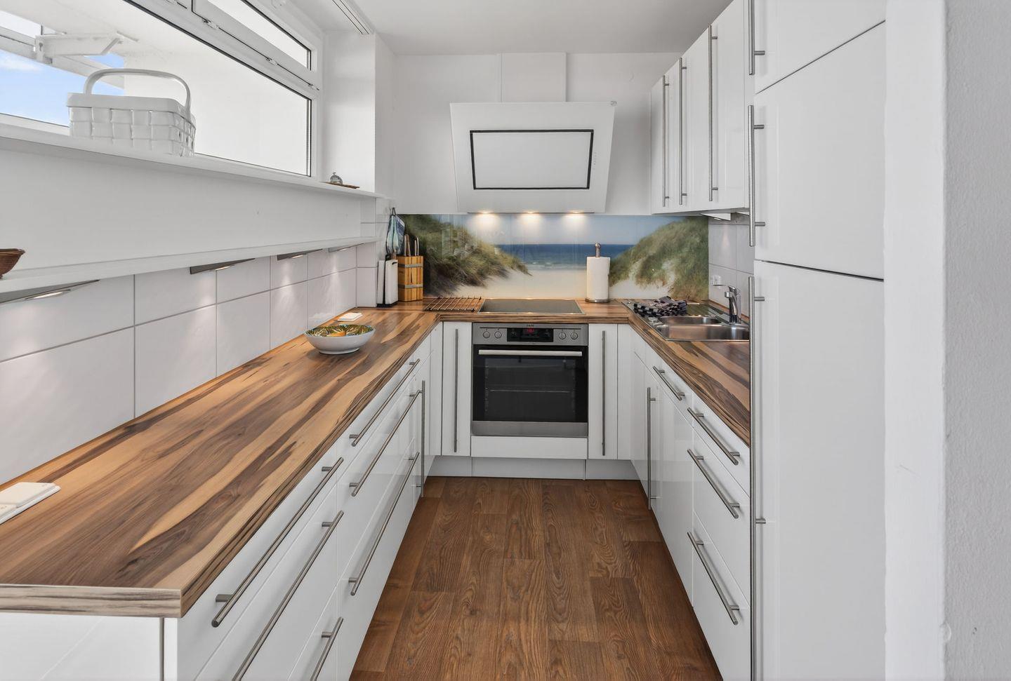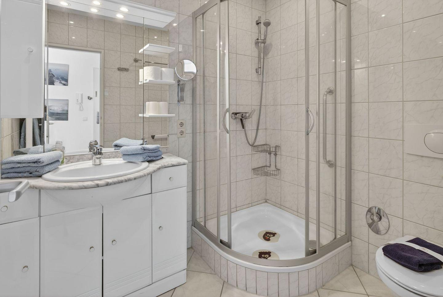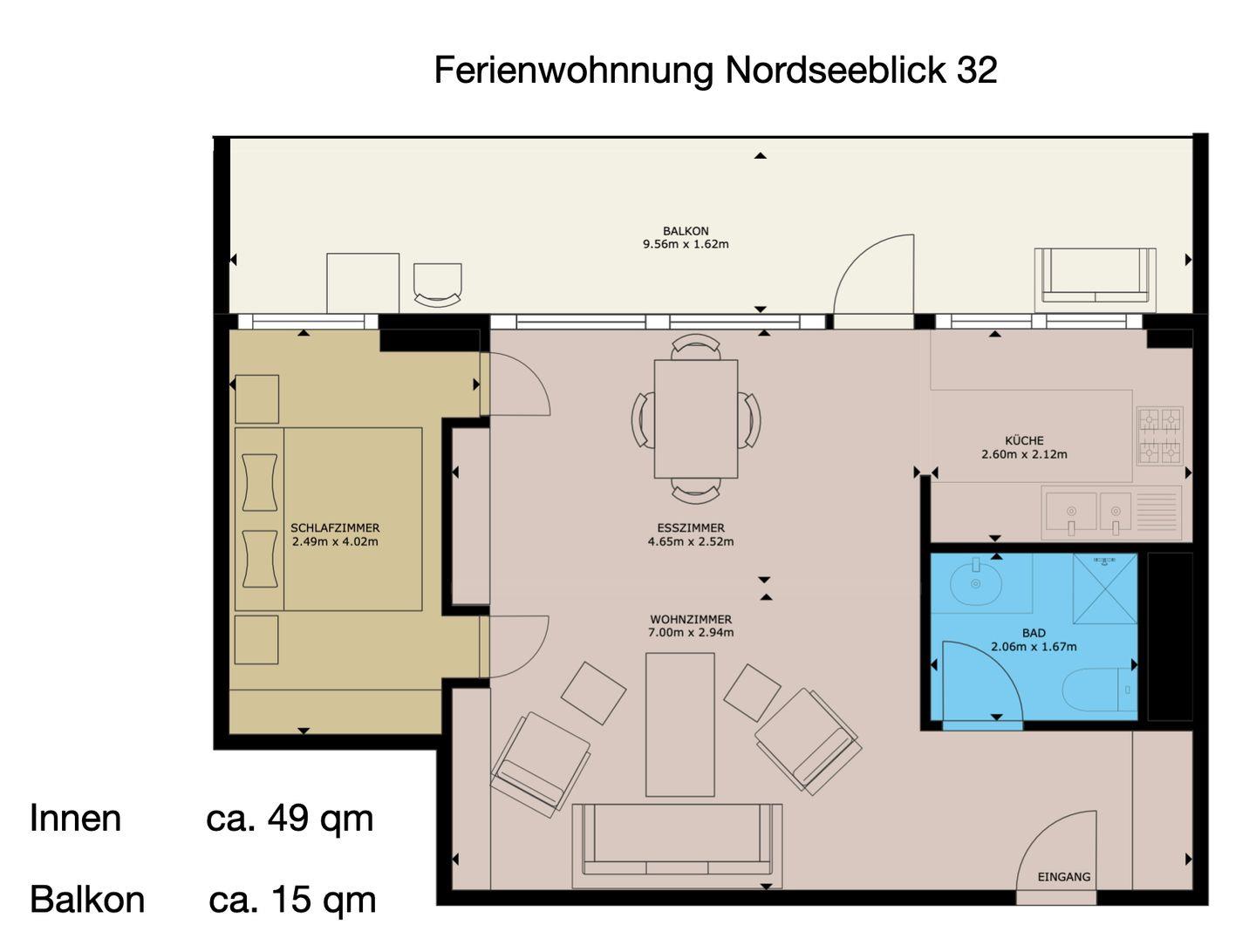 Auch der großzügige, ca. 15 m² große Balkon ist nach Norden ausgerichtet und ermöglicht ebenfalls einen freien Blick auf die Nordsee. Das separate Schlafzimmer ist mit einem Doppelbett ausgestattet; die Matratzen haben das Maß 1,00 x 2,00 m. Durch Jalousien ist eine vollständige Verdunkelung möglich. Die neue Küche ist funktional und hochwertig ausgestattet und verfügt über Geschirrspüler, Backofen und Cerankochfeld sowie über ausreichend Stauraum. Das Badezimmer ist mit einer Dusche ausgestattet; ein Handtuchtrockner (Heizkörper) ist vorhanden. Ein TV steht in der Wohnung zur Verfügung.