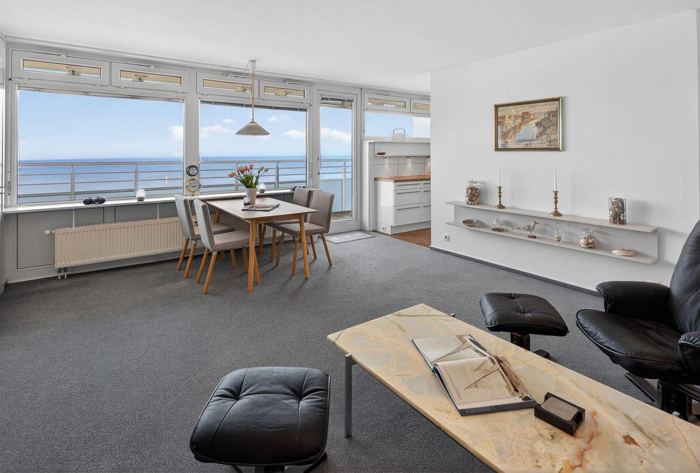 Die Ferienwohnung Nordseeblick 32 befindet sich im Haus Nordseeblick in 1A-Lage in erster Reihe auf Norderney. Die Wohnung liegt im 5. Obergeschoss und ist bequem mit dem Fahrstuhl erreichbar. Mit einer Wohnfläche von ca. 50 m² ist sie auf die Nutzung durch 2 Personen ausgerichtet. Der Wohnbereich ist zur Seeseite orientiert und bietet durch eine große Fensterfront einen direkten, unverbaubaren Meerblick.