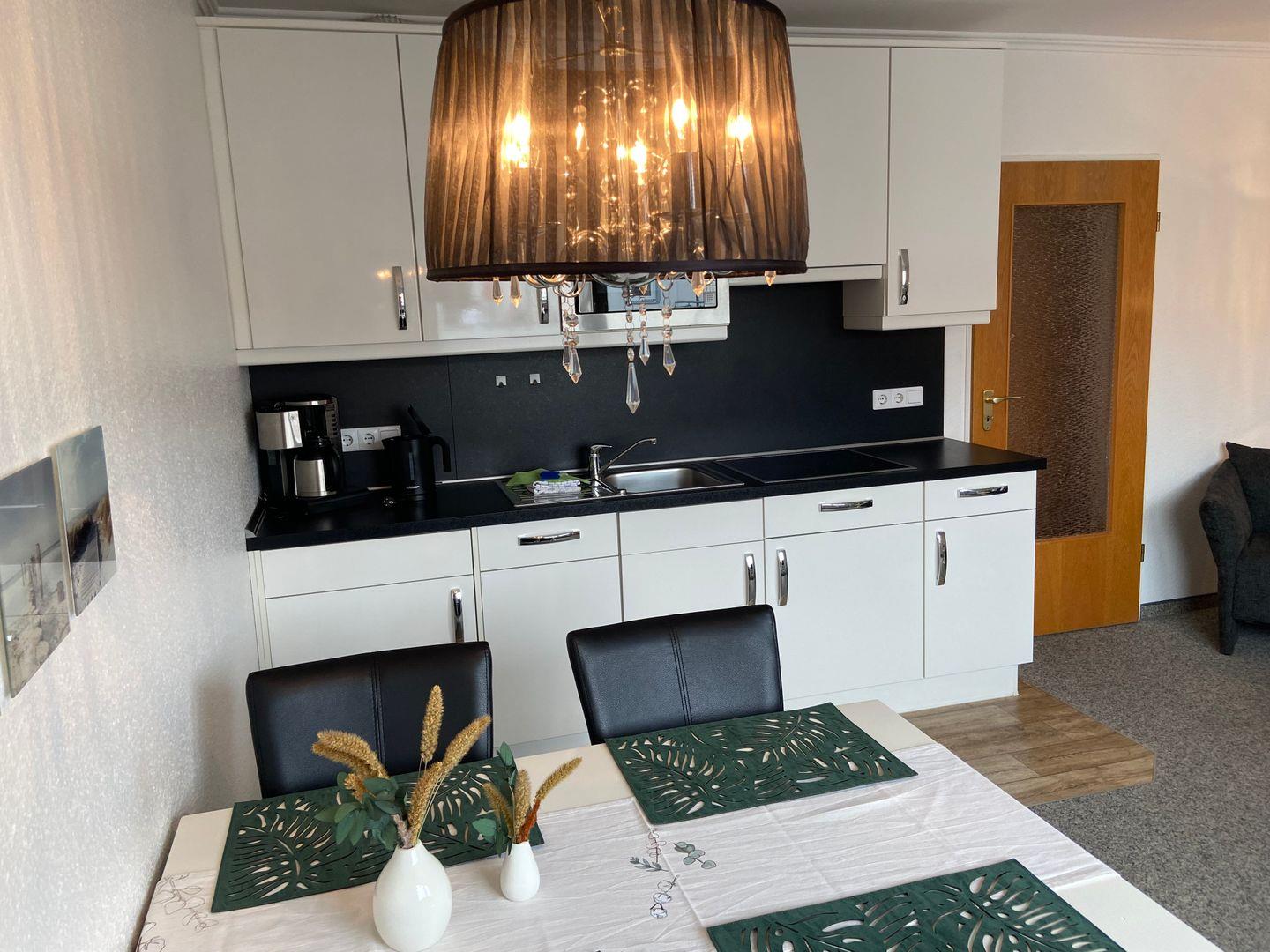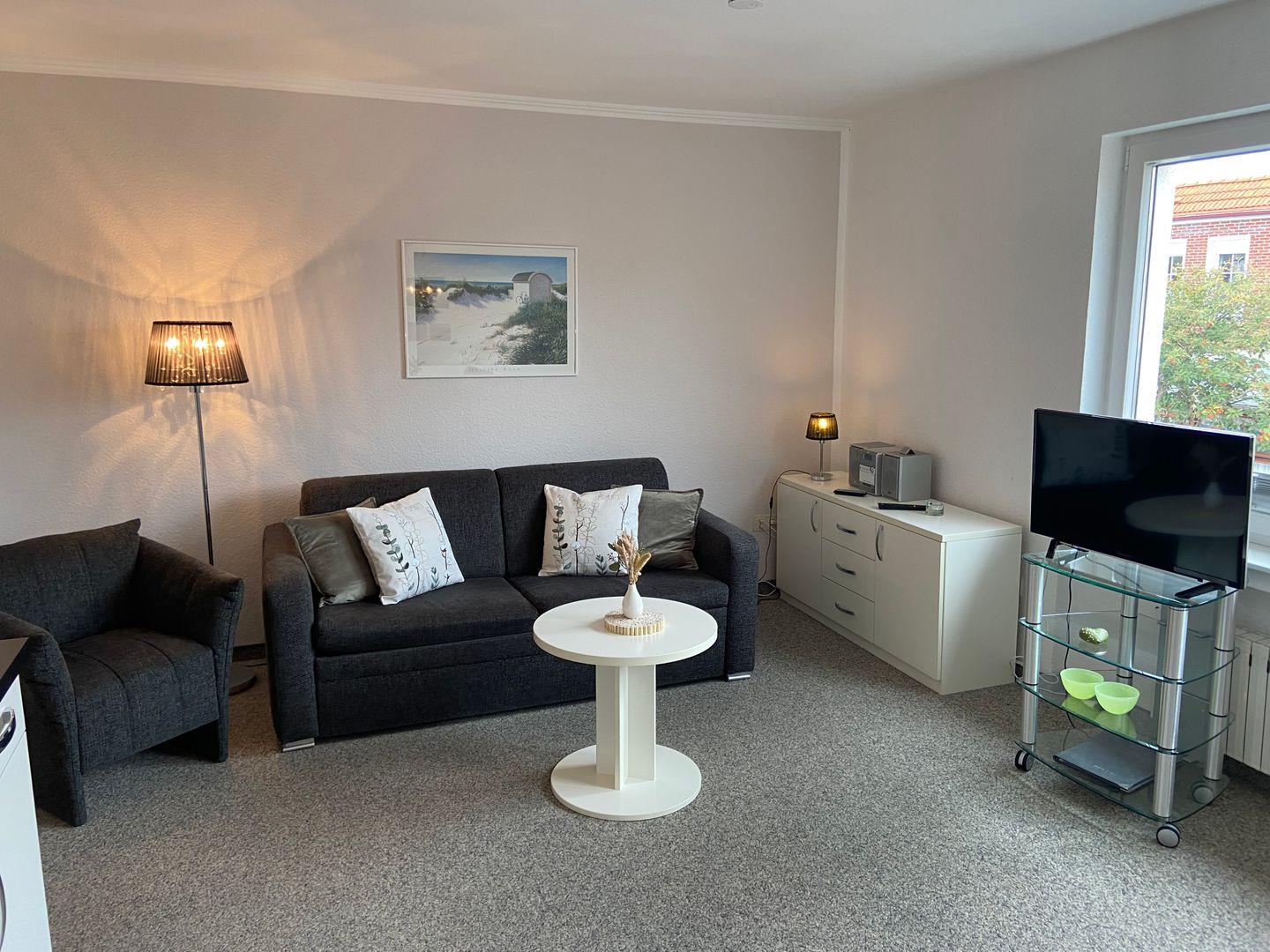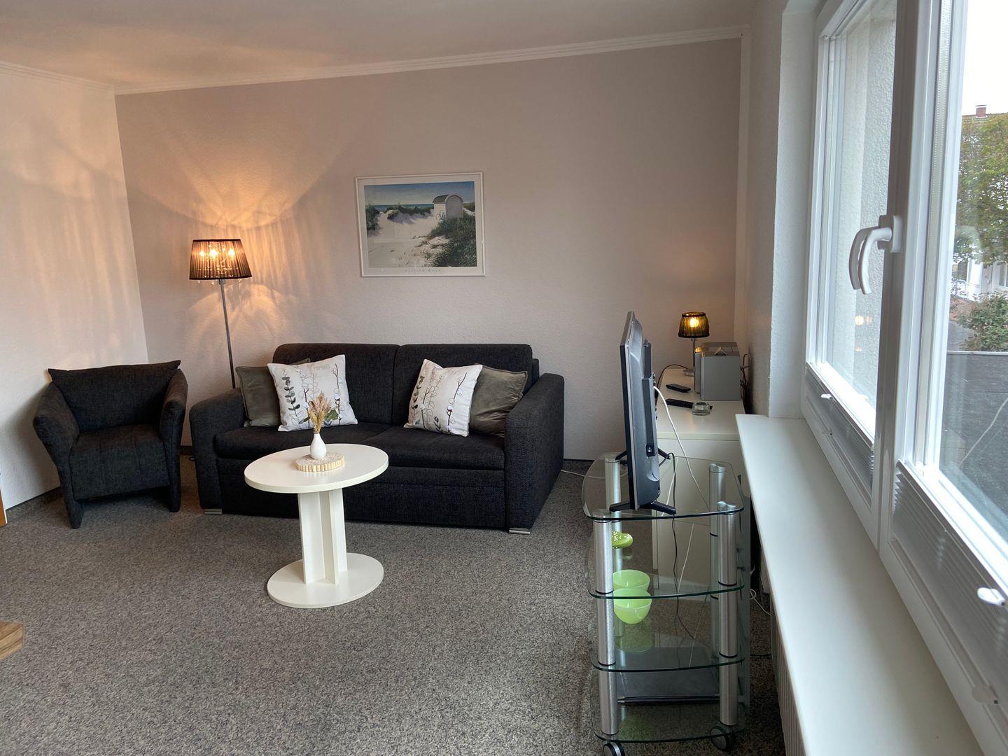 separates Schlafzimmer mit Doppelbett und zusätzlicher Sitzgelegenheit, Wohn-Schlafraum (Schlafsofa 1,60 x 2m) mit voll ausgestatteter Küchenzeile und Essecke. Badezimmer mit Dusche/WC. Hinter dem Haus befindet sich eine Gemeinschaftsterrasse, die Sie gerne nutzen können. Im Haus Kleeblatt befinden sich 3 weitere Ferienwohnungen. Bäcker, Lebensmittelgeschäfte und die Strandpromenade sind die Straße rauf oder runter fußläufig zu erreichen.