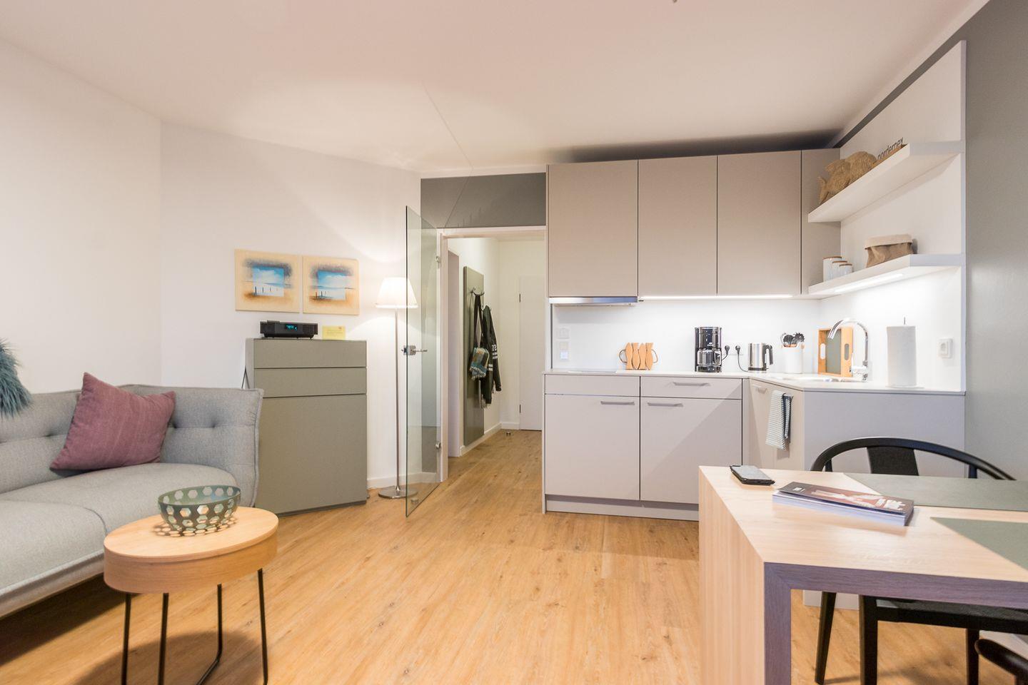 Auch, weil unsere Ferienwohnungen mehr als einfach nur Standards setzen. Die komfortable 2-Zimmer-Wohnung im 1. OG mit ca. 45 m² Wohnfläche wurde im November 2018 komplett neu renoviert und möbliert. Sie verfügt über eine im großzügigen Wohnraum komplett eingerichtete Küchenzeile mit Geschirrspüler.
