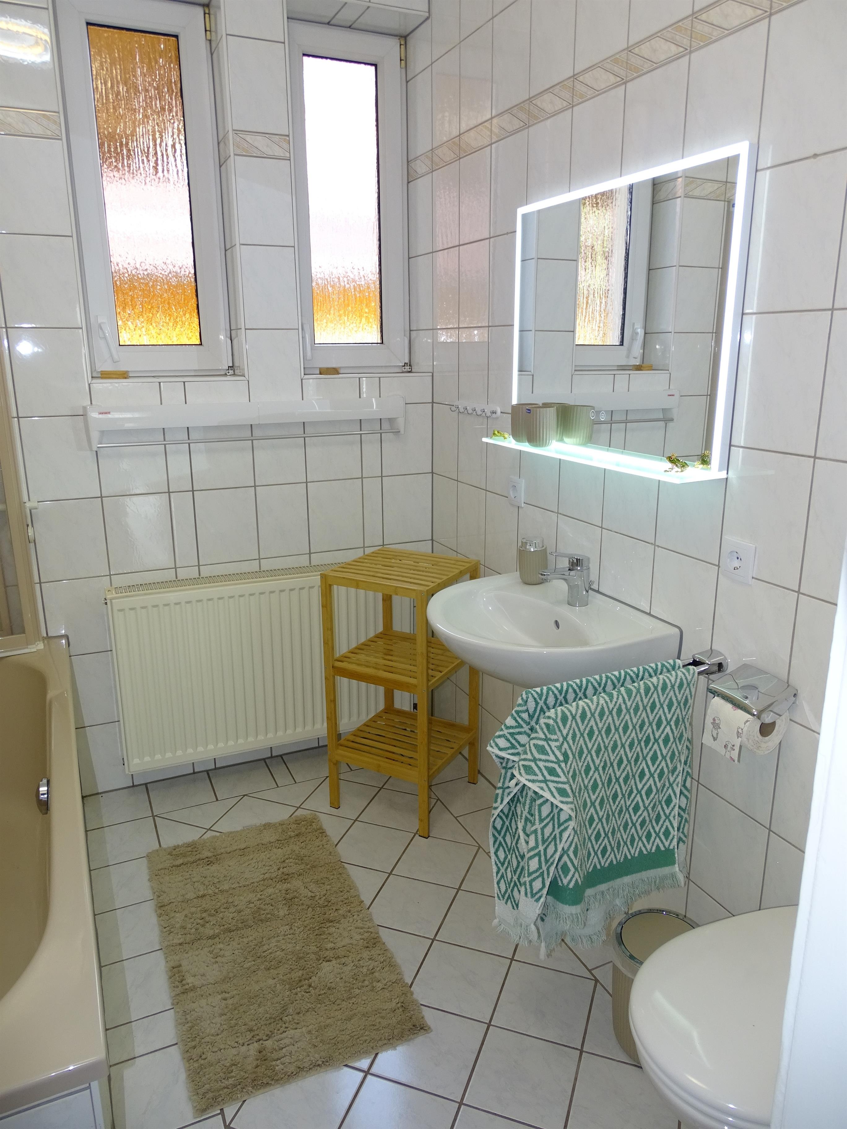 Weiterhin weist die Ferienwohnung ein Tageslicht-Bad sowie eine separate voll eingerichtete Küche mit einem Esstisch und 5 Stühlen auf. In fast allen Räumen ist ein wohnliches Massivholz-Parkett vorhanden; wir bitten daher um das Mitbringen und Benutzen von Hausschuhen. Im grünen Außenbereich gibt es eine überdachte Sitz- und Grillmöglichkeit.