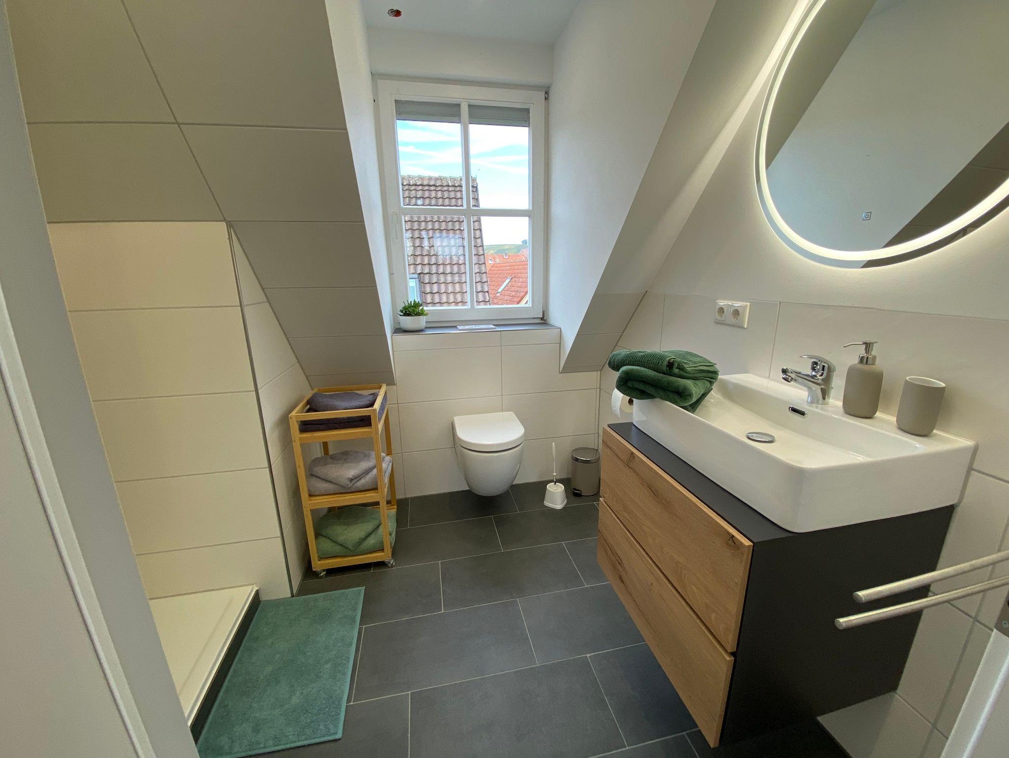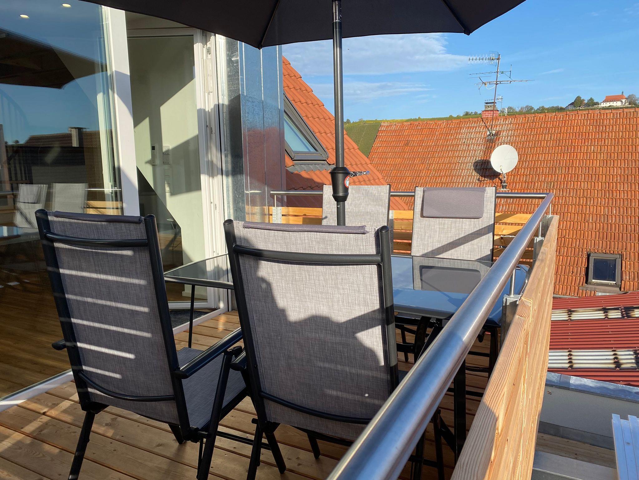 Ihr Ferienappartement befindet sich im 2. Obergeschoss unseres Hauses. Die helle und gut ausgestattete Wohnung hat 65 qm und ist für 2 bis maximal 4 Personen bestens geeignet. Sie verfügt über zwei getrennte, großzügige Schlafzimmer. Das eine ist mit einem Doppelbett (180x200cm) ausgestattet, das andere mit zwei komfortablen Einzelbetten(90x200cm). Der offene und großzügig geschnittene Wohnbereich lädt zum Verweilen ein. Integriert ist die ist die gut ausgestattete Küchenzeile. Sie enthält unteranderem einen Backofen mit zugehörigem Cerankochfeld, eine Kaffeemaschine, Wasserkocher, Toaster, Mikrowelle und ausreichend Geschirr. Angrenzend an den Wohnbereich liegt der große Balkon mit Blick über die Dächer Nordheims und auf die Weinlage Escherndorfer Lump. Dieser ist ausgestattet mit Gartenmöbel für das ein oder ander Glas fränkischen Weins im Freien. Das Bad mit Dusche und WC wird Ihren Ansprüchen mehr als entsprechen. Alle Fahrradurlauber finden in der Garage Platz für Ihre Bikes. Autos können sie auf den zahlreichen öffentlichen Parkplätzen rund um das Haus parken. Auch kostenfreies WLAN ist für Sie am Start.