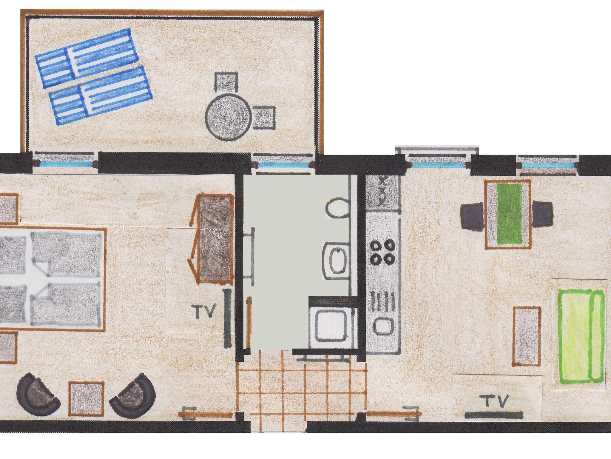 Die Wohnung hat ca. 50 m² in Richtung Südosten mit einem großen Balkon (12 m²). Sie besteht aus einem Schlafraum mit Doppelbett und Flat-TV; einer Wohnküche mit Couch und Essplatz, Spülmaschine, Ceranfeld, Backofen, Microwelle, Kühlschrank mit Gefrierfach, Wasserkocher, Kaffeemaschine und Toaster sowie einem Bad mit Dusche, WC, Waschtisch, Kosmetikspiegel, Fön, Handtuchheizkörper, Fußbodenheizung und Außenfenster.