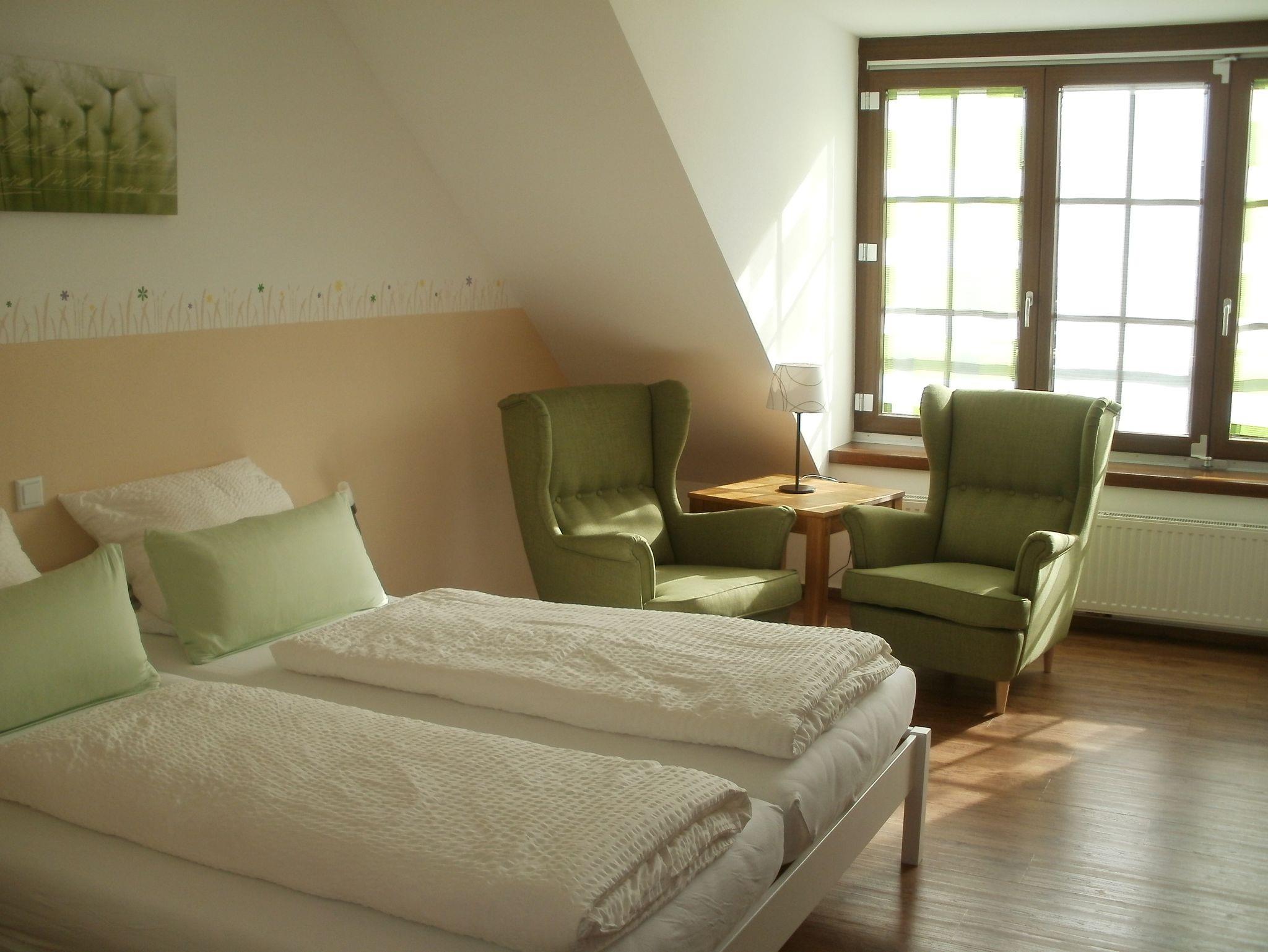 Das Doppelzimmer ist ausgestattet mit einer gemütlichen Sitzecke, Dusche/WC, Kühlschrank, Kaffee-/Teekocher, Sat-TV und Radio/CD-Player.