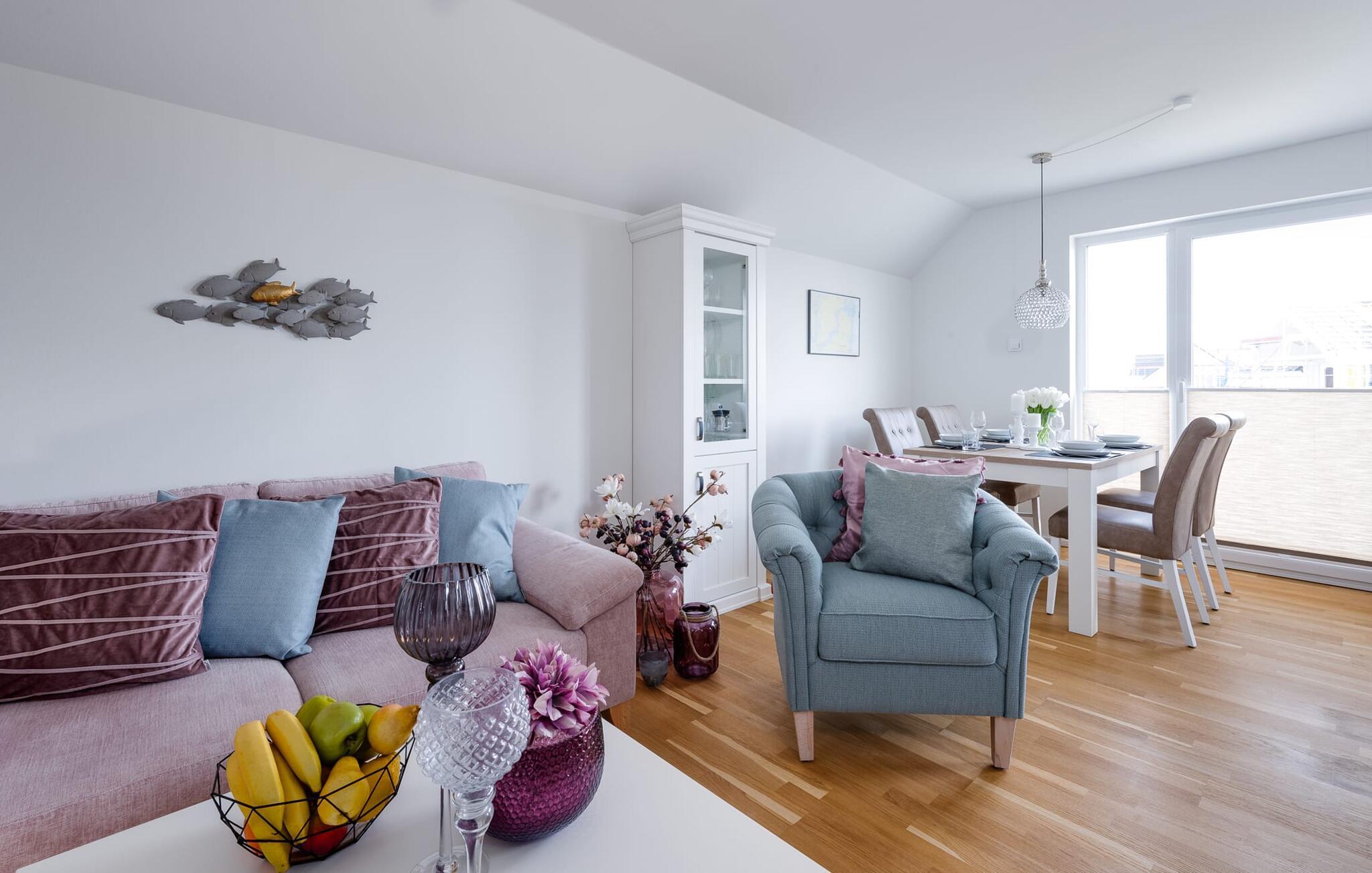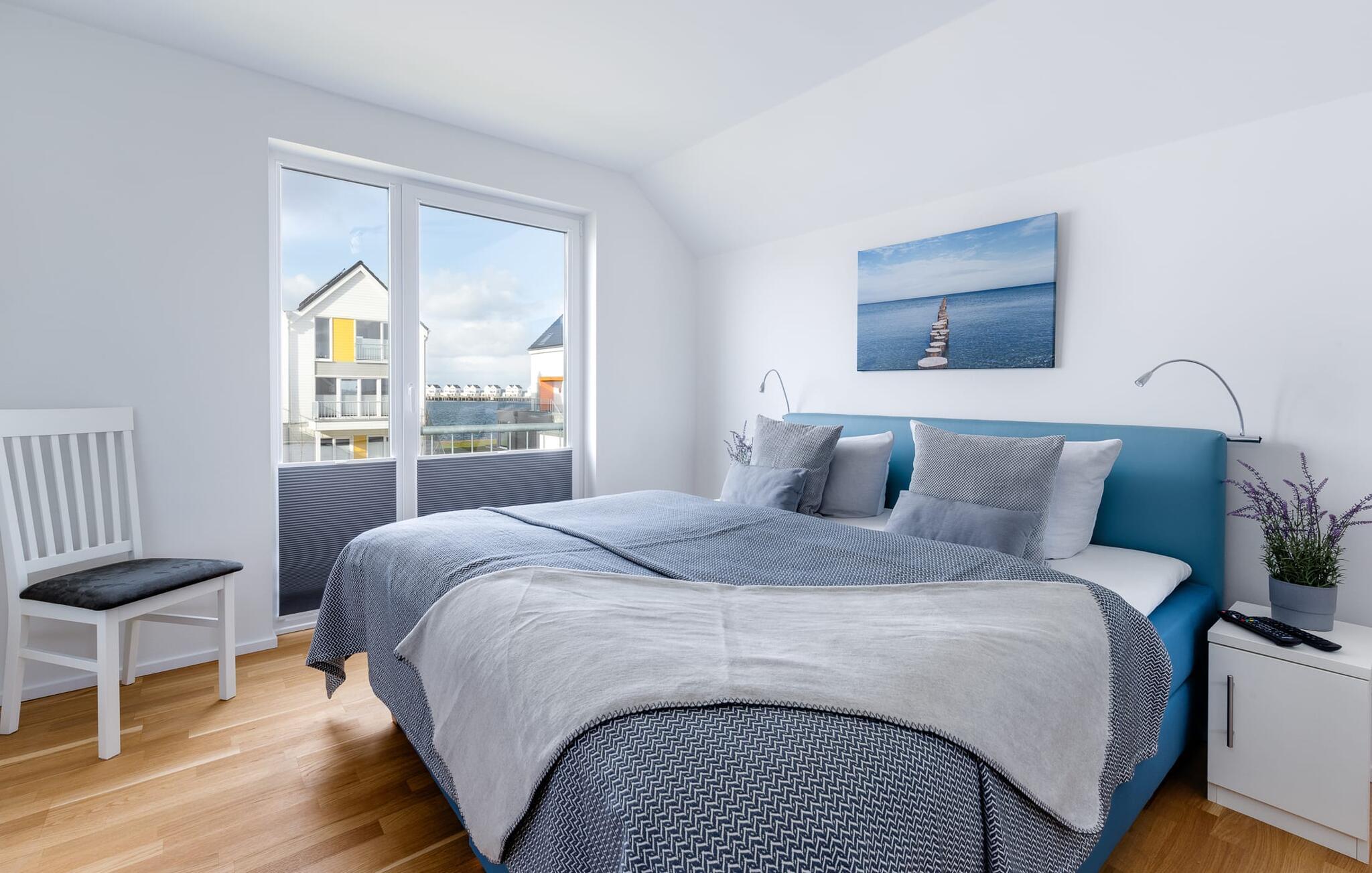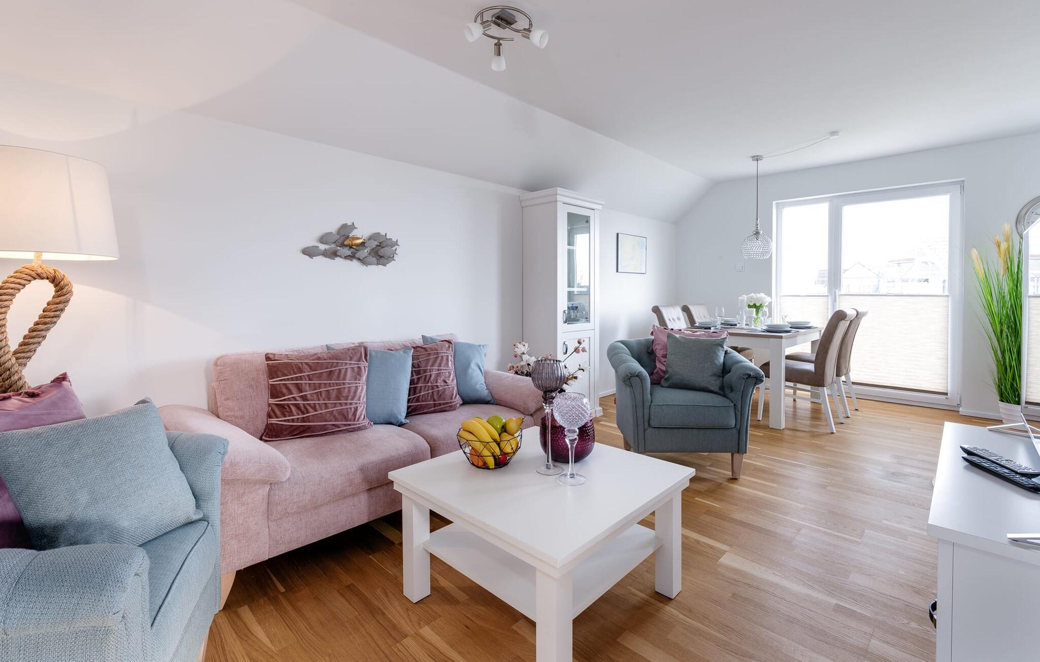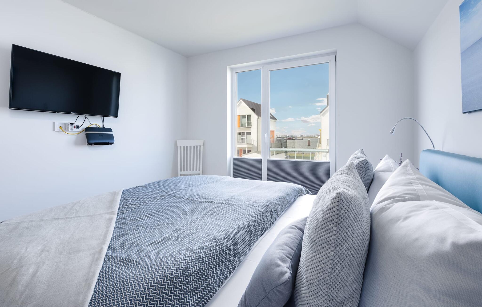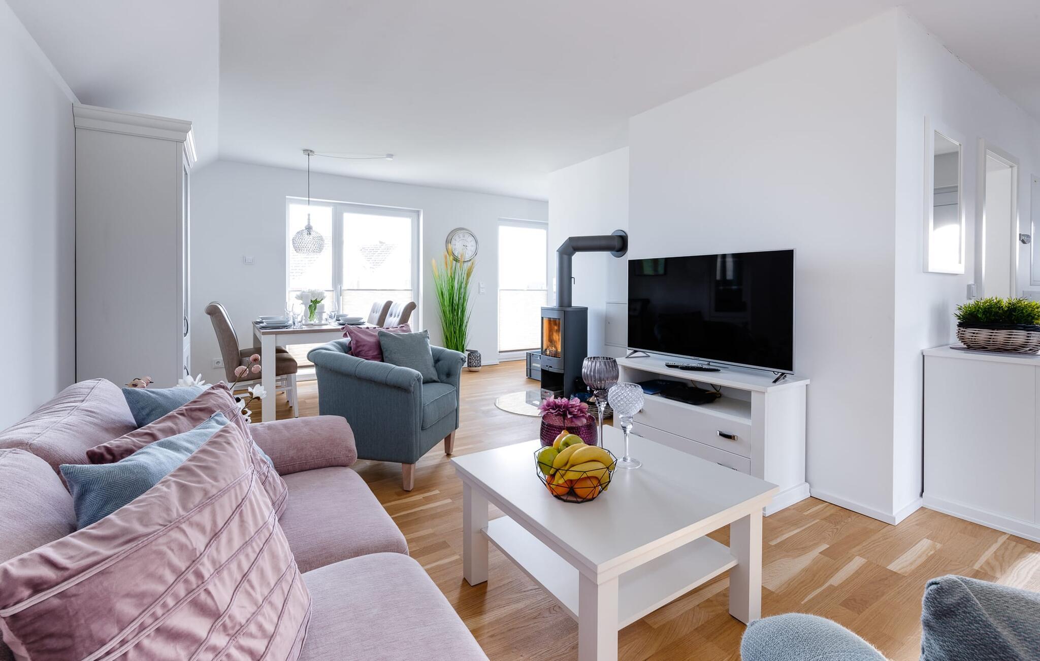 På ferien er der tid til kreativ madlavning. Det omfattende køkken-alrum lader intet tilbage at ønske. I direkte tilknytning til spisepladsen ligger den rummelige sydøstvendte solterrasse, hvor der er to liggestole til rådighed. I kan nyde solen fra morgen til aften. Et smart-tv med et Telekom-hjemmeunderholdningsprogram er tilgængeligt i opholdsområdet. Lejligheden er udstyret med WiFi, så I kan surfe som I ønsker. De to soveværelser er udstyret med højkvalitets boxmadrasser og byder på en smuk udsigt over havnen.