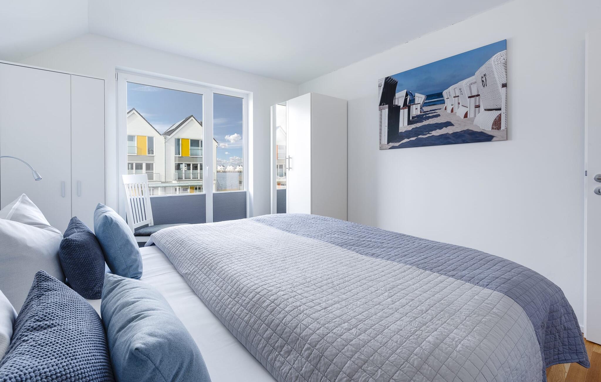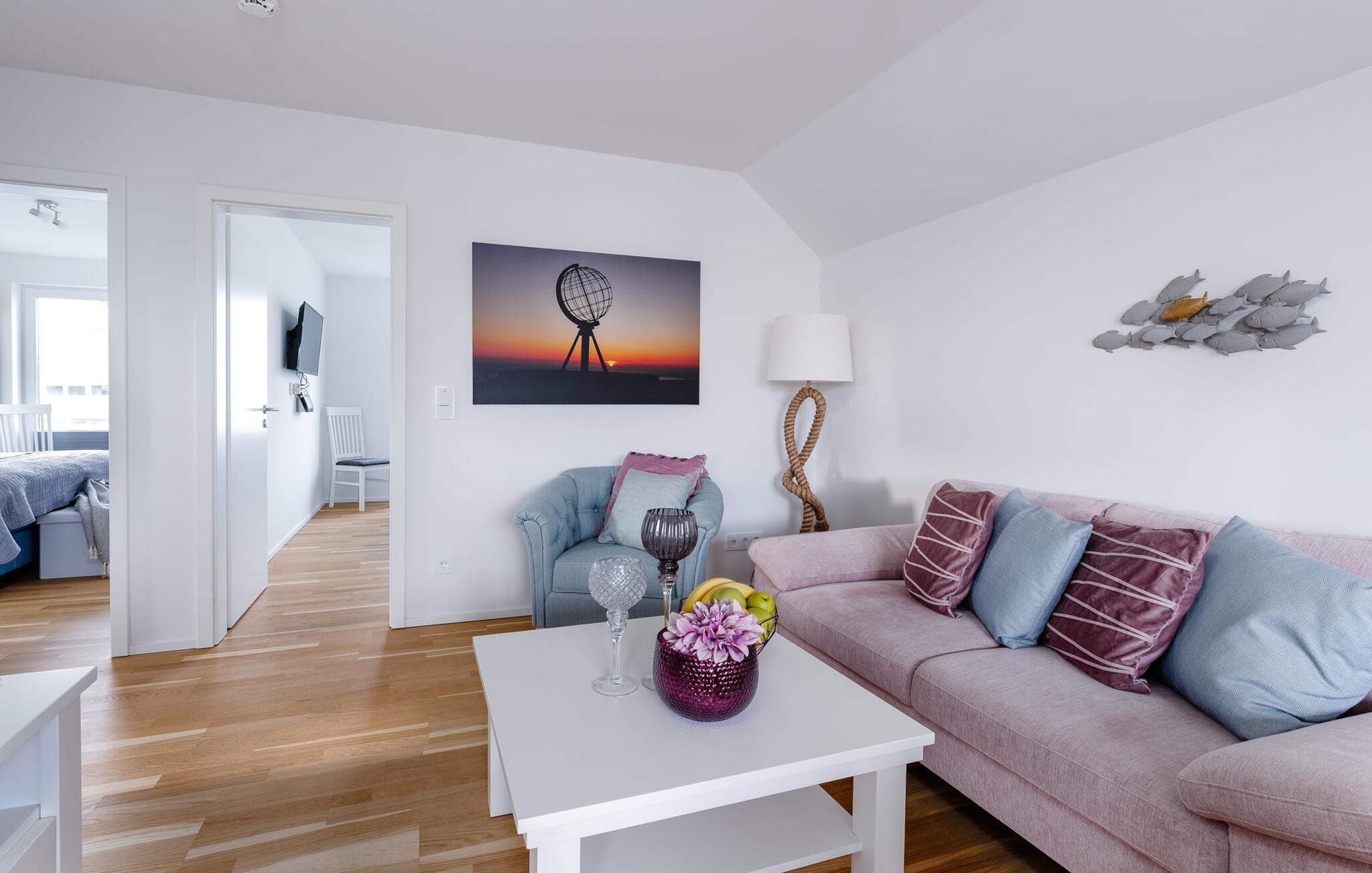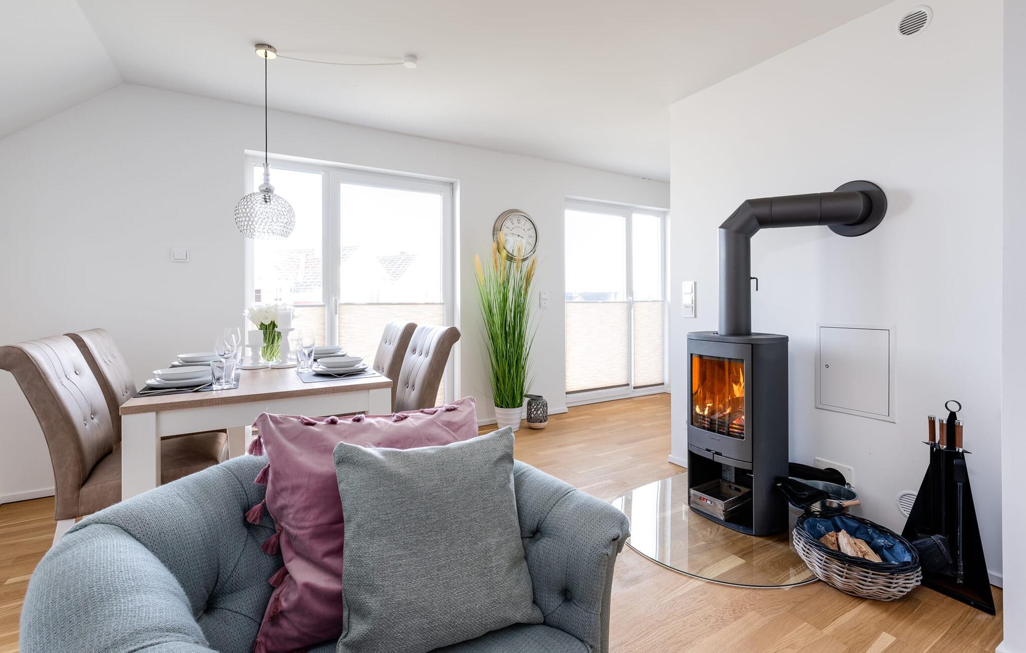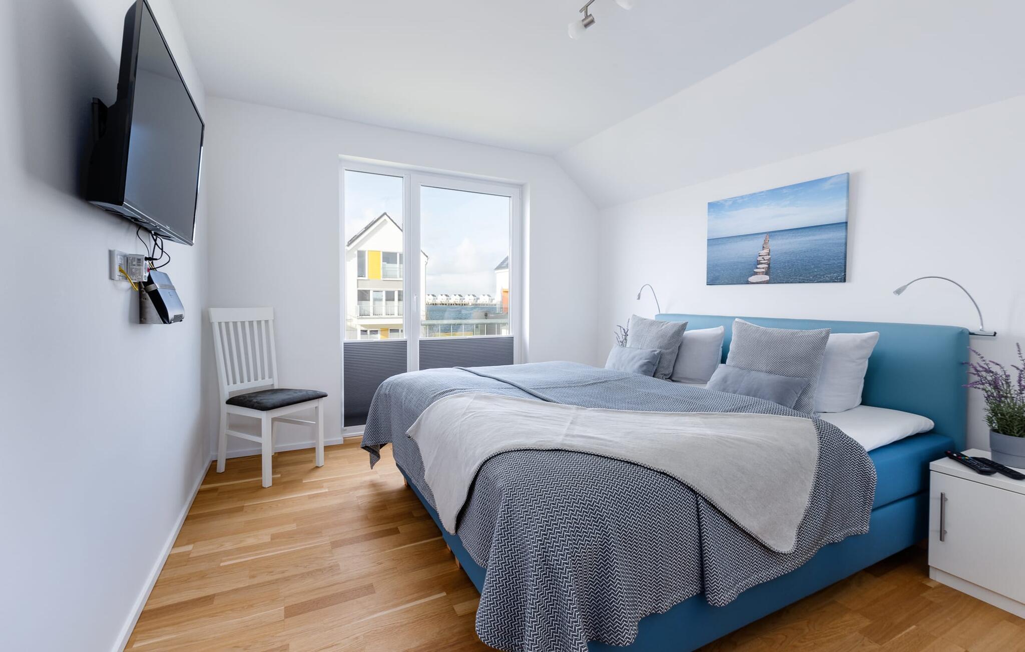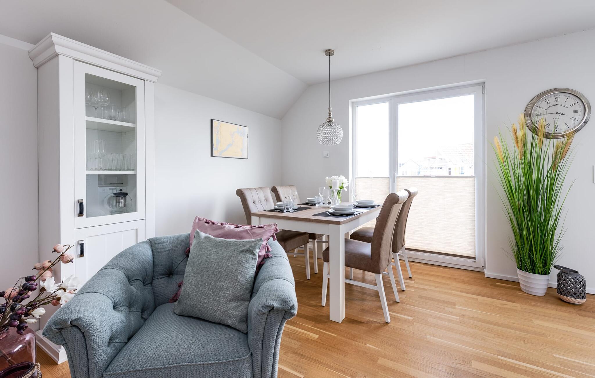 På ferien er der tid til kreativ madlavning. Det omfattende køkken-alrum lader intet tilbage at ønske. I direkte tilknytning til spisepladsen ligger den rummelige sydøstvendte solterrasse, hvor der er to liggestole til rådighed. I kan nyde solen fra morgen til aften. Et smart-tv med et Telekom-hjemmeunderholdningsprogram er tilgængeligt i opholdsområdet. Lejligheden er udstyret med WiFi, så I kan surfe som I ønsker. De to soveværelser er udstyret med højkvalitets boxmadrasser og byder på en smuk udsigt over havnen.