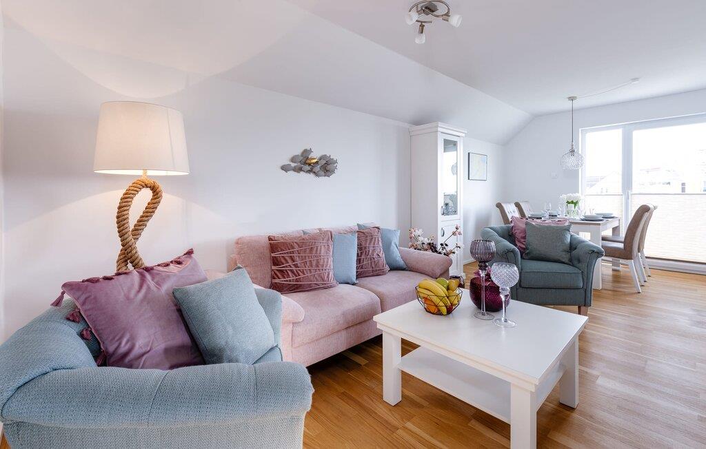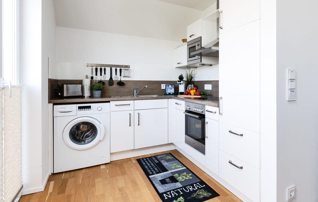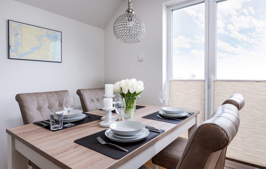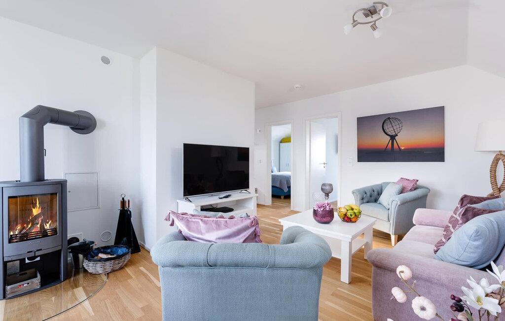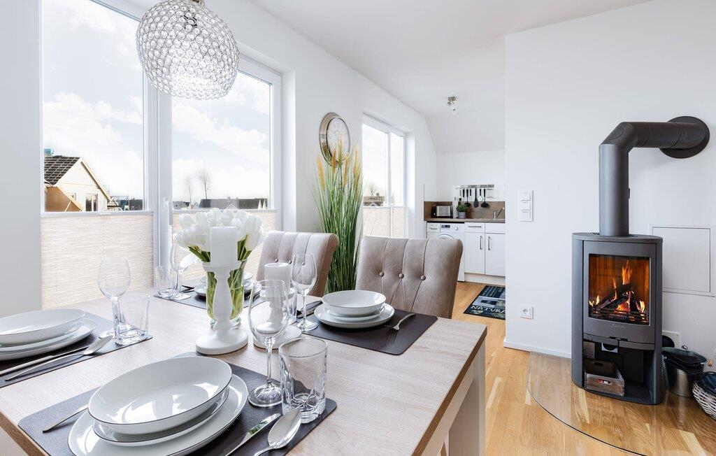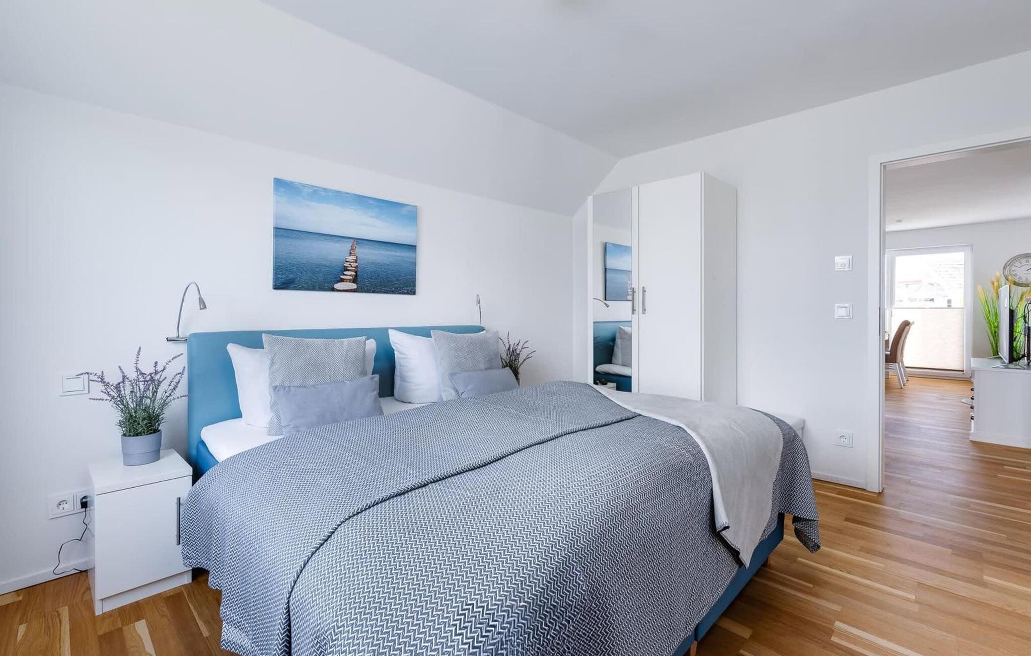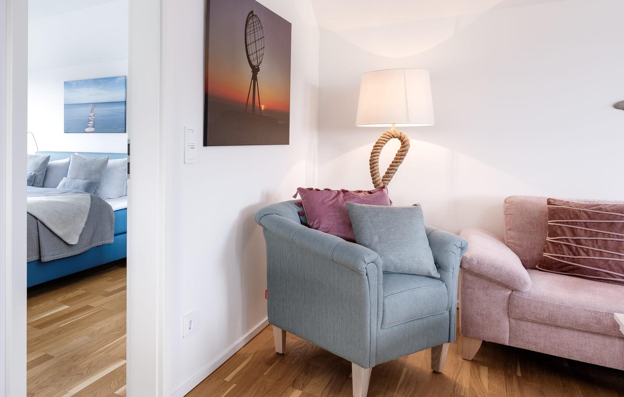 På ferien er der tid til kreativ madlavning. Det omfattende køkken-alrum lader intet tilbage at ønske. I direkte tilknytning til spisepladsen ligger den rummelige sydøstvendte solterrasse, hvor der er to liggestole til rådighed. I kan nyde solen fra morgen til aften. Et smart-tv med et Telekom-hjemmeunderholdningsprogram er tilgængeligt i opholdsområdet. Lejligheden er udstyret med WiFi, så I kan surfe som I ønsker. De to soveværelser er udstyret med højkvalitets boxmadrasser og byder på en smuk udsigt over havnen.