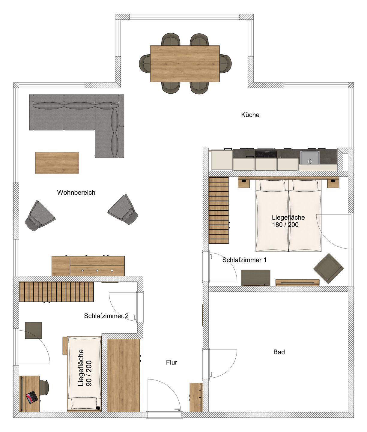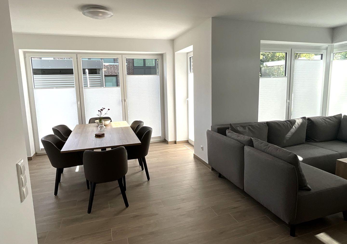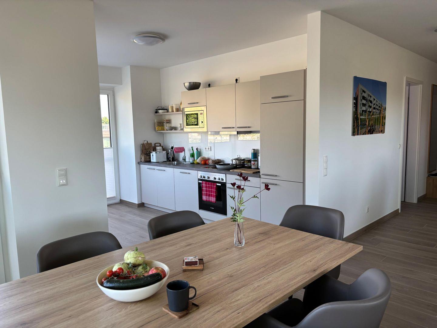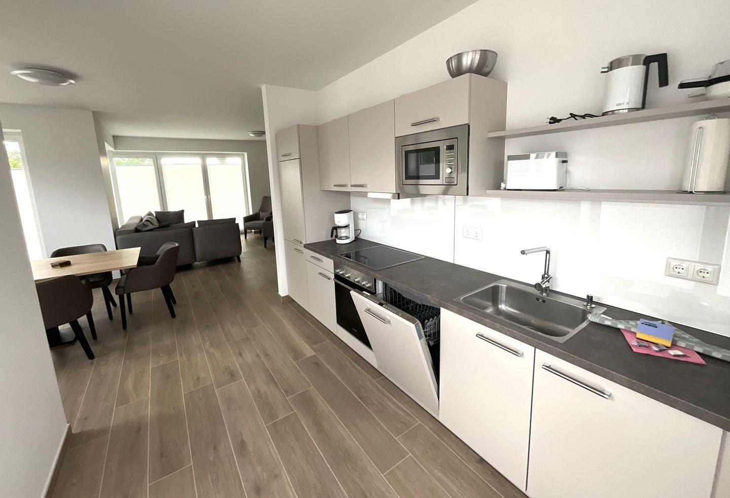 Die offen zum Wohnzimmer gestaltete Küche ist modern ausgestattet und ermöglicht gemeinsames Kochen und Genießen. Sie finden hier einen Ceranherd, Backofen, Kühlschrank mit Gefrierfach, Spülmaschine, Mikrowelle, Wasserkocher, Toaster sowie eine Kaffeemaschine und sämtliche Küchenutensilien, Geschirr und Besteck. Der angrenzende Essbereich mit Esstisch lädt zu geselligen Mahlzeiten ein, während in der Sofaecke mit bequemer Sitzgelegenheit mit Fernseher für abwechslungsreiche Unterhaltung sorgen. Die gesamte Wohnung ist mit Fliesenböden ausgestattet, was nicht nur für einen eleganten Stil, sondern auch für angenehme Fußbodenheizung sorgt.