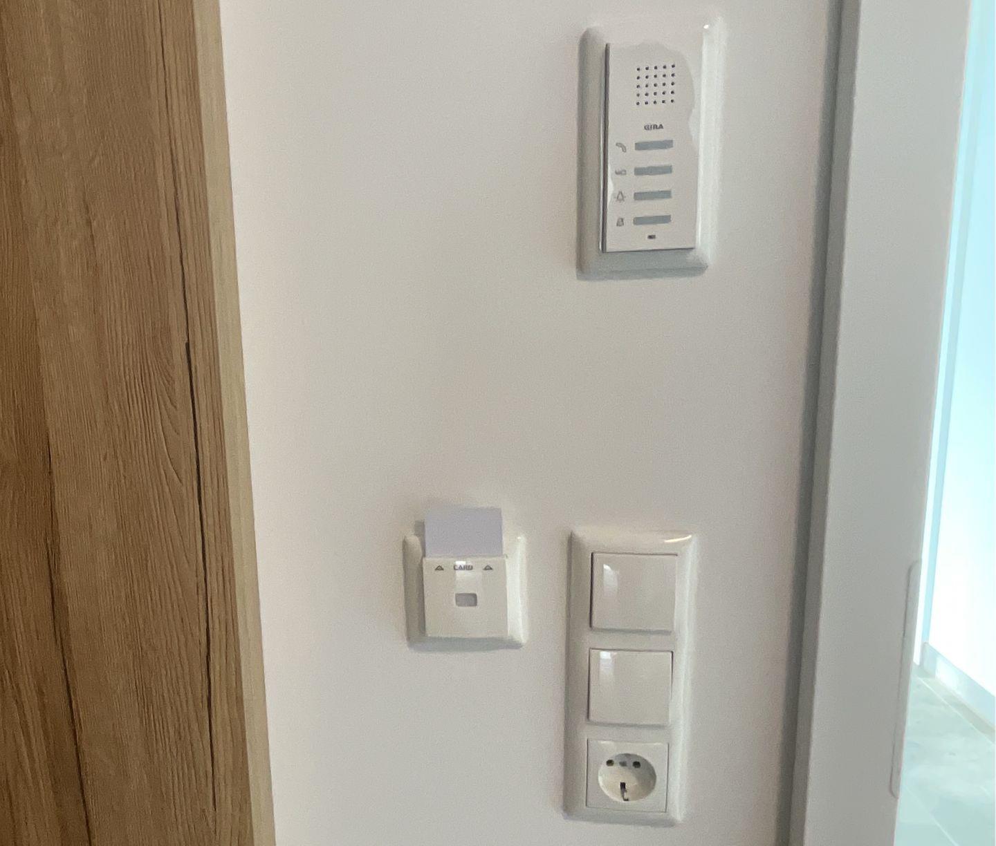 Flur: Aktivierung der Stromzufuhr der Wohnung durch eine Stromkarte. Flur mit Garderobe, Schuh- und Garderobenschrank, Staubsauger