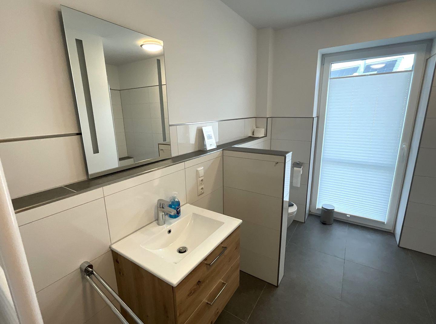 Das hochwertige Badezimmer ist mit eigener Sauna, bodengleicher Dusche, WC, Waschbecken, Spiegel, Fenster, Haartrockner und allen notwendigen Annehmlichkeiten eingerichtet. Eine Waschmaschine und ein Trockner stehen zur Eigennutzung bereit.