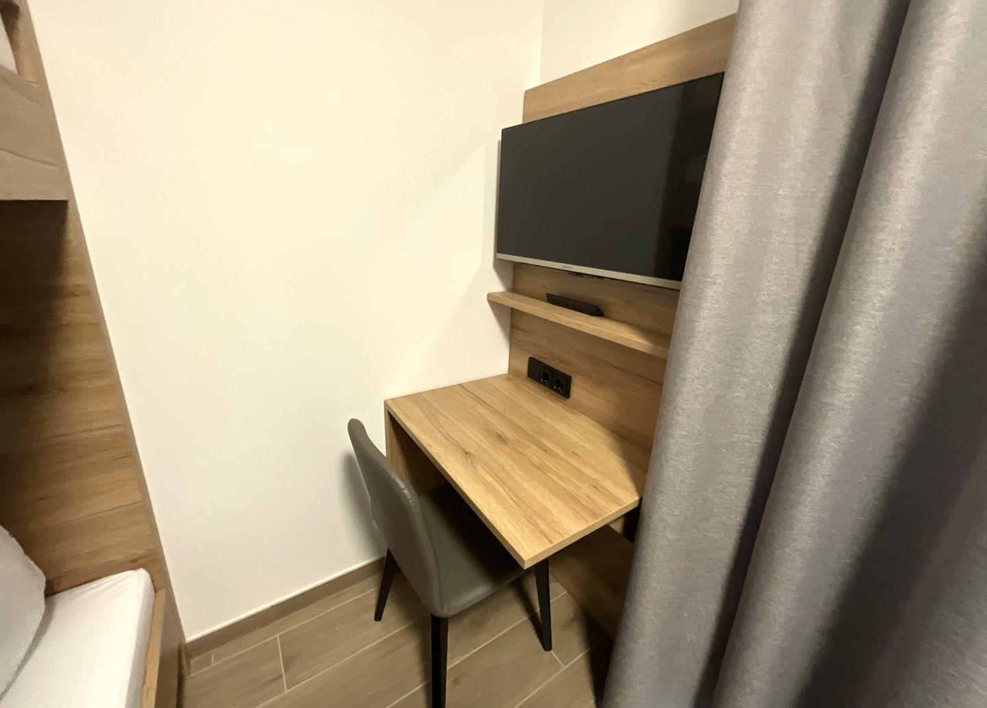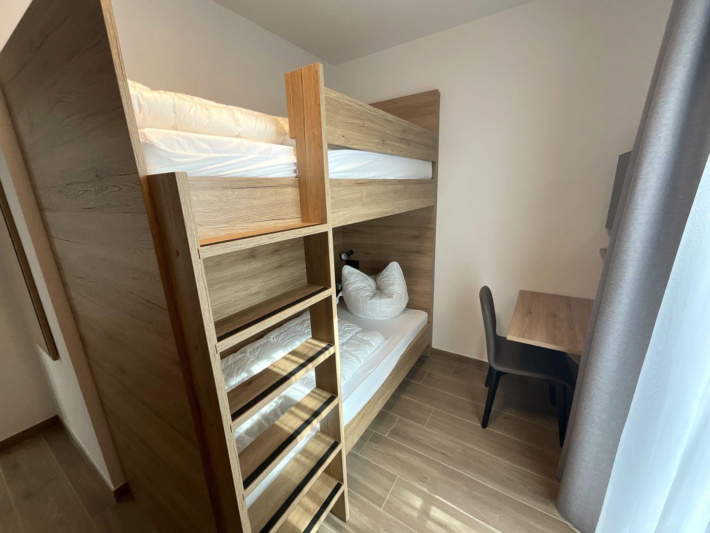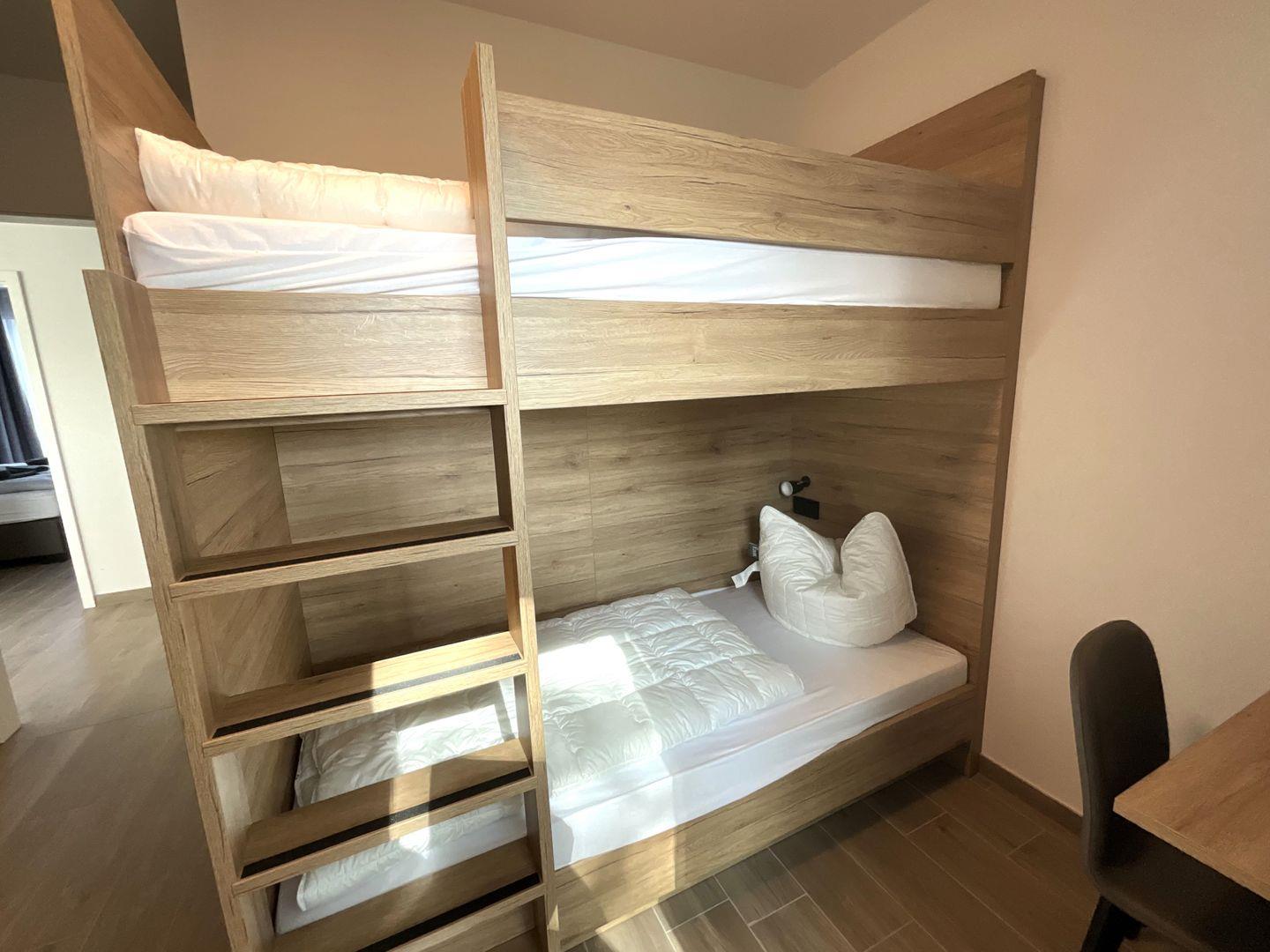 Schlafzimmer 2: Etagenbett (Maße: 2 x 90x200 cm), Flat-TV, Leselampen, Kleiderschrank, Verdunkelungsvorhänge