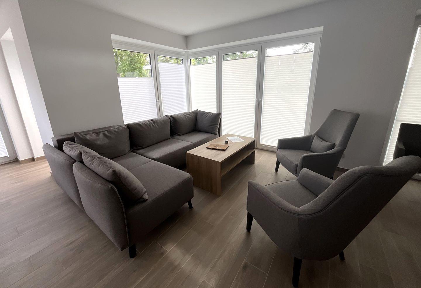 Wohnzimmer: gemütliche Sitzecke mit Sessel, Sofa, Flachbildfernseher, Empfang deutschsprachiger TV-Programme