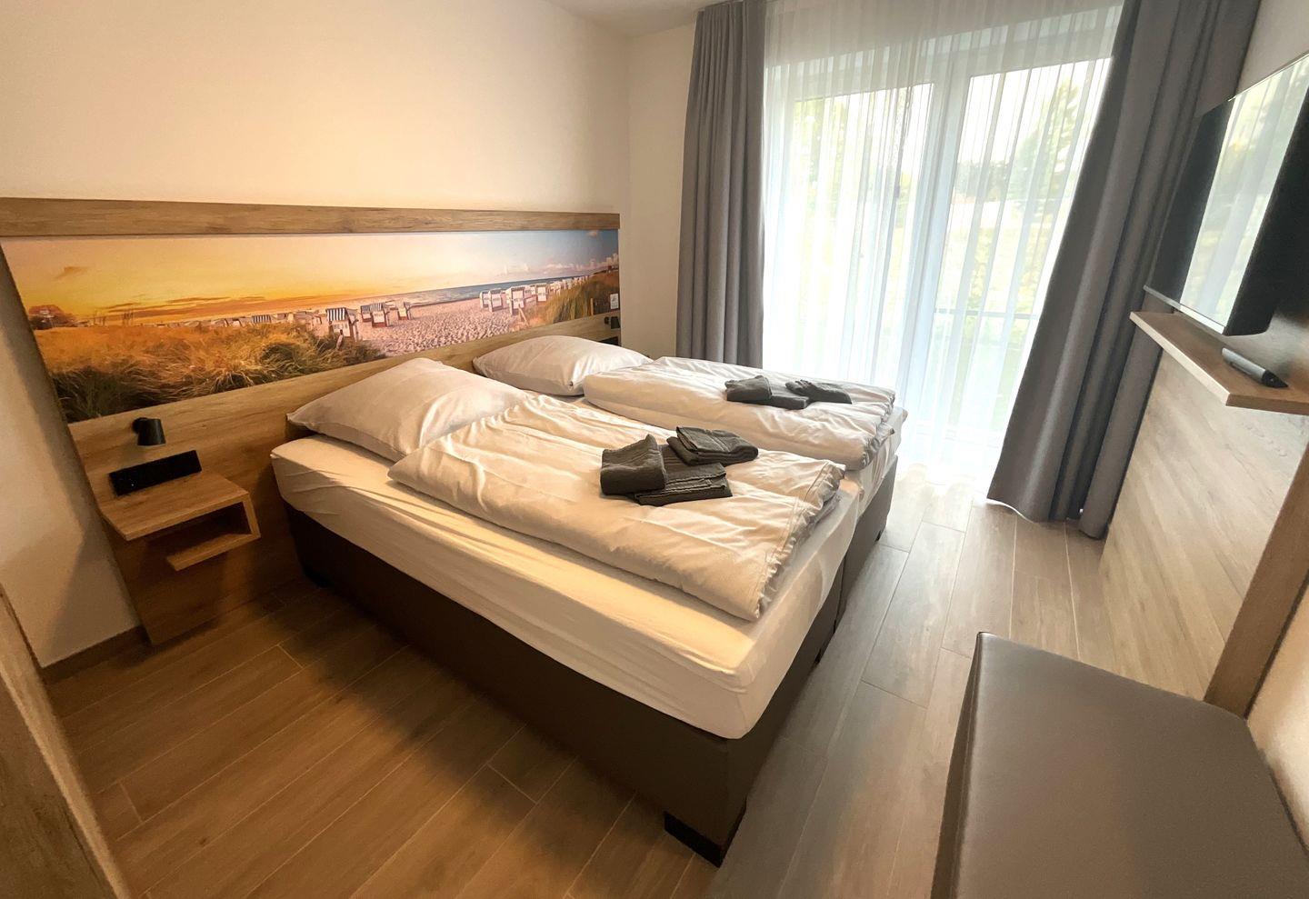 Schlafzimmer 1: Doppelbett (Maße: 180 x 200 cm - 2 Einzelmatratzen á 90x200cm), Flat-TV, Leselampen, Kleiderschrank, Verdunkelungsvorhänge