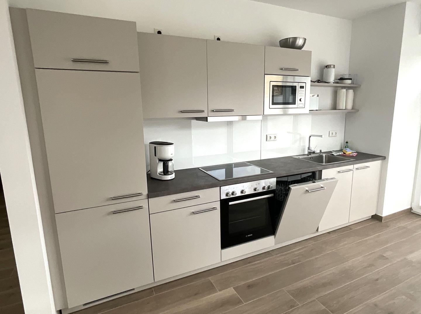 Küche und Haushalt: Einbauküche, Kühlschrank mit Gefrierfach, 4-Zonen Cerankochfeld, Backofen, Mikrowelle, Dunstabzugshaube, Geschirrspüler, Toaster, Wasserkocher, Kaffeefiltermaschine, hochwertiges Geschirr und Besteck