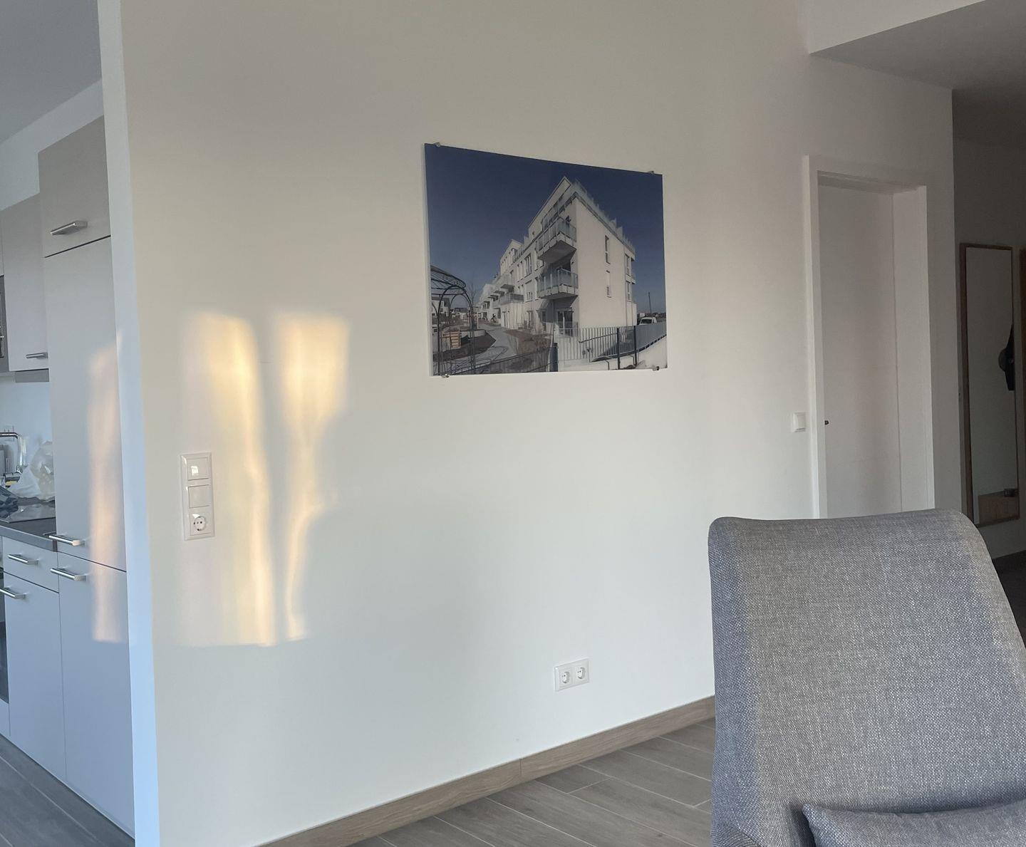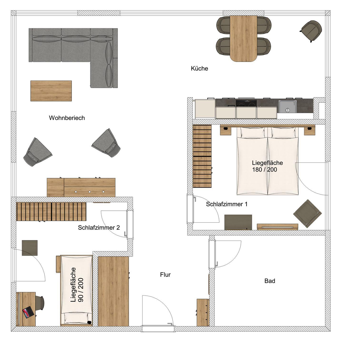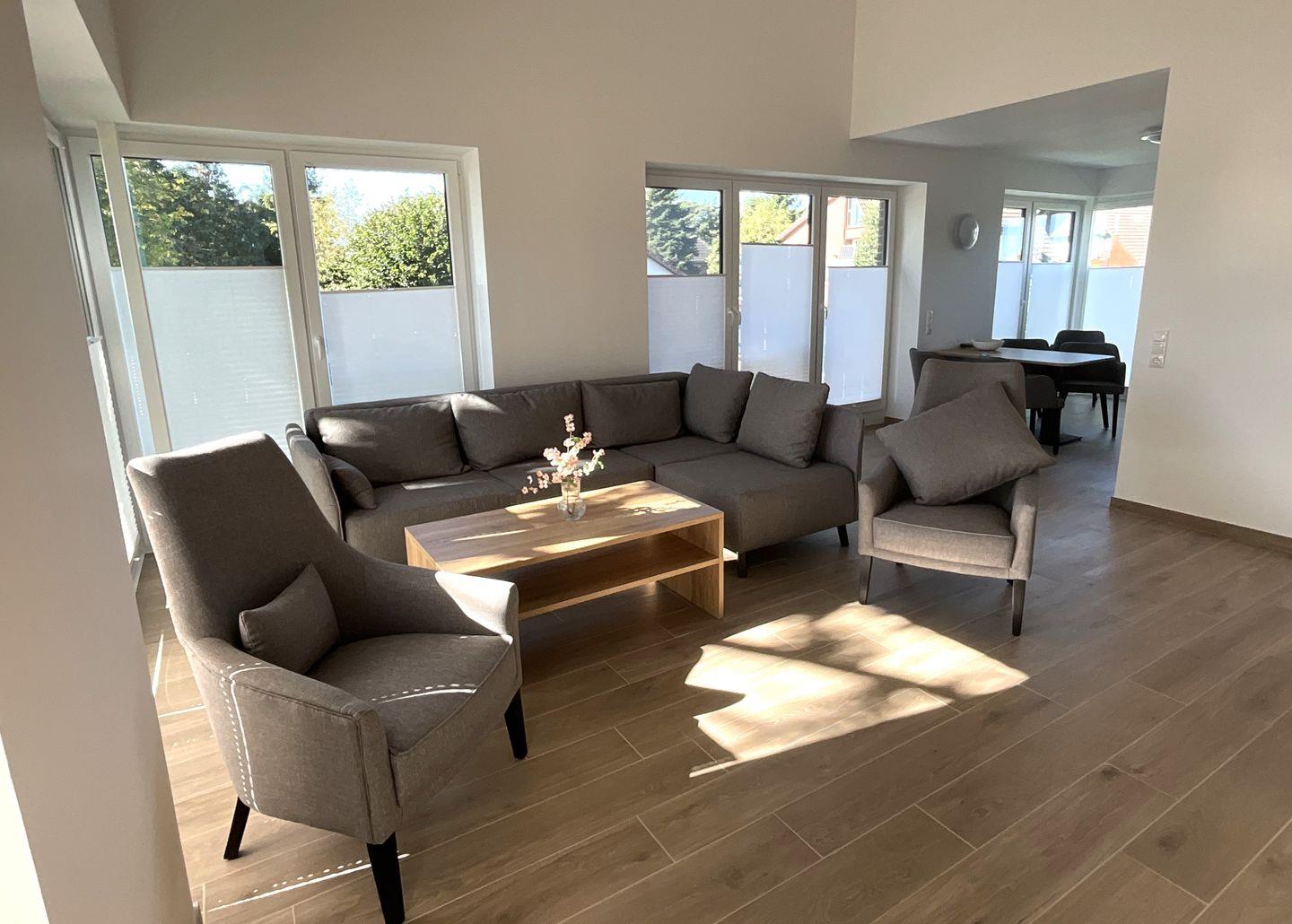 Die offen zum Wohnzimmer gestaltete Küche ist modern ausgestattet und ermöglicht gemeinsames Kochen und Genießen. Sie finden hier einen Ceranherd, Backofen, Kühlschrank mit Gefrierfach, Spülmaschine, Mikrowelle, Wasserkocher, Toaster sowie eine Kaffeemaschine und sämtliche Küchenutensilien, Geschirr und Besteck. Der angrenzende Essbereich mit Esstisch lädt zu geselligen Mahlzeiten ein, während in der Sofaecke mit bequemer Sitzgelegenheit mit Fernseher für abwechslungsreiche Unterhaltung sorgen. Die gesamte Wohnung ist mit Fliesenböden ausgestattet, was nicht nur für einen eleganten Stil, sondern auch für angenehme Fußbodenheizung sorgt.