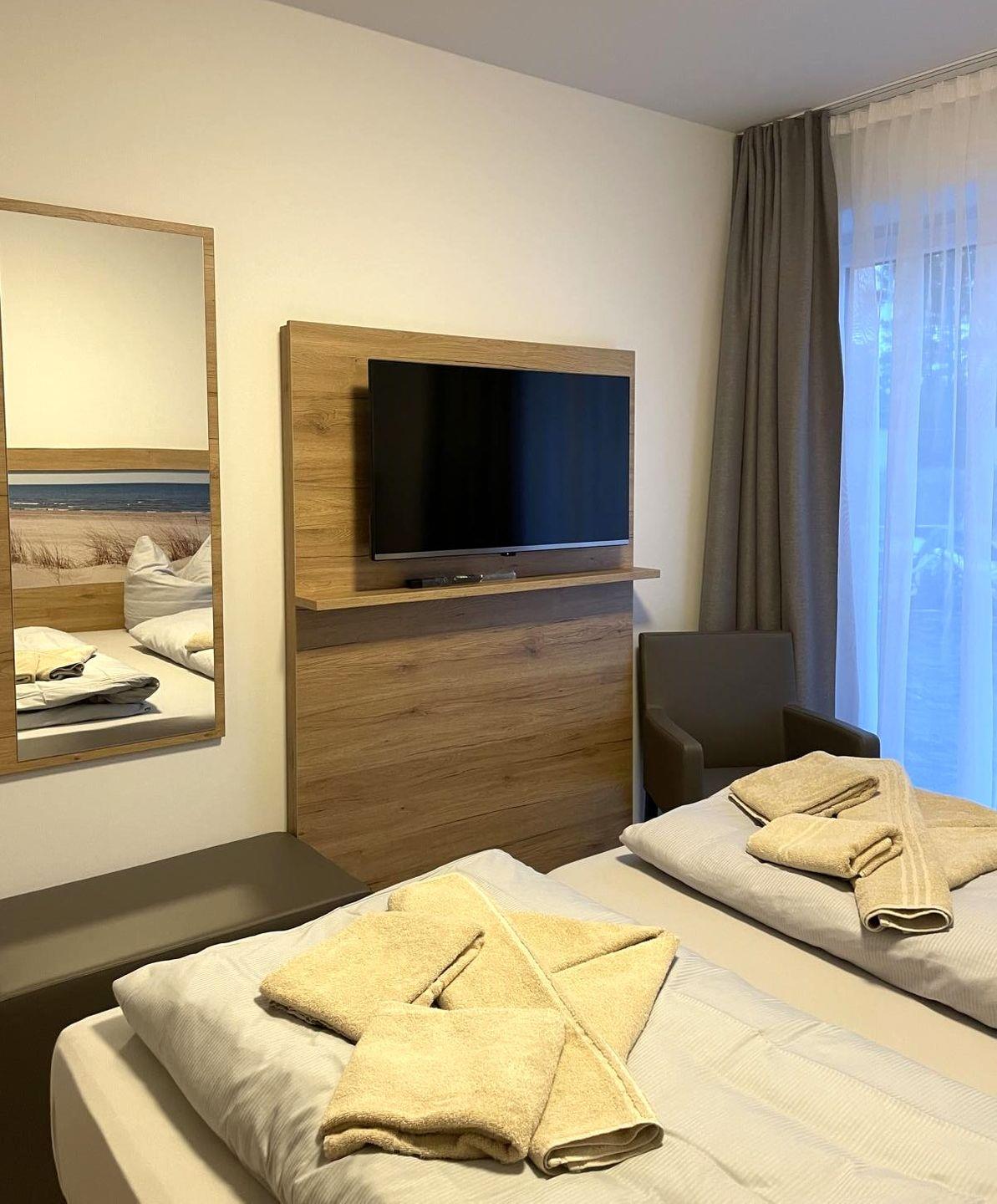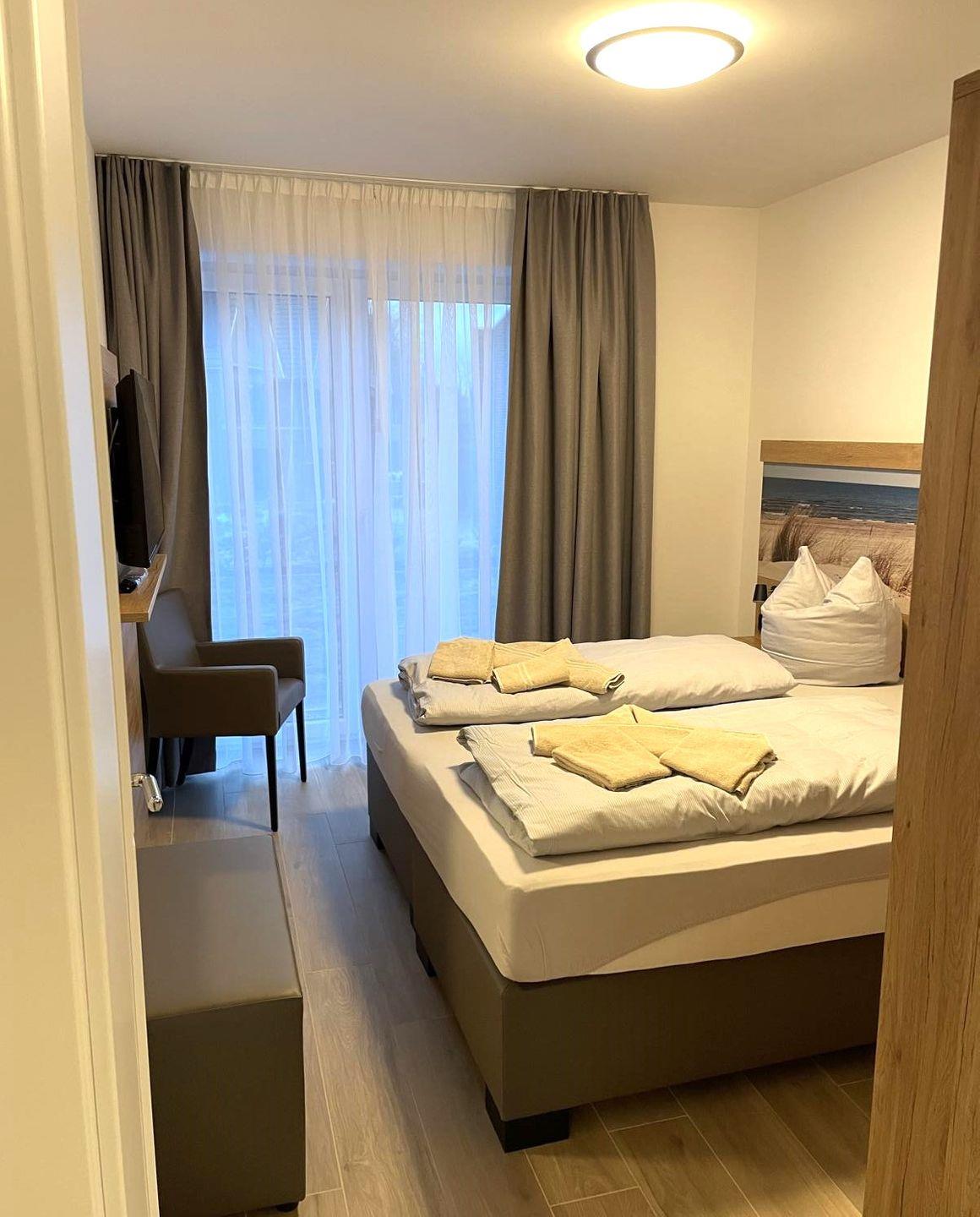 Schlafzimmer 1: Doppelbett (Maße: 180 x 200 cm - 2 Einzelmatratzen á 90x200cm), Flat-TV, Leselampen, Kleiderschrank, Verdunkelungsvorhänge