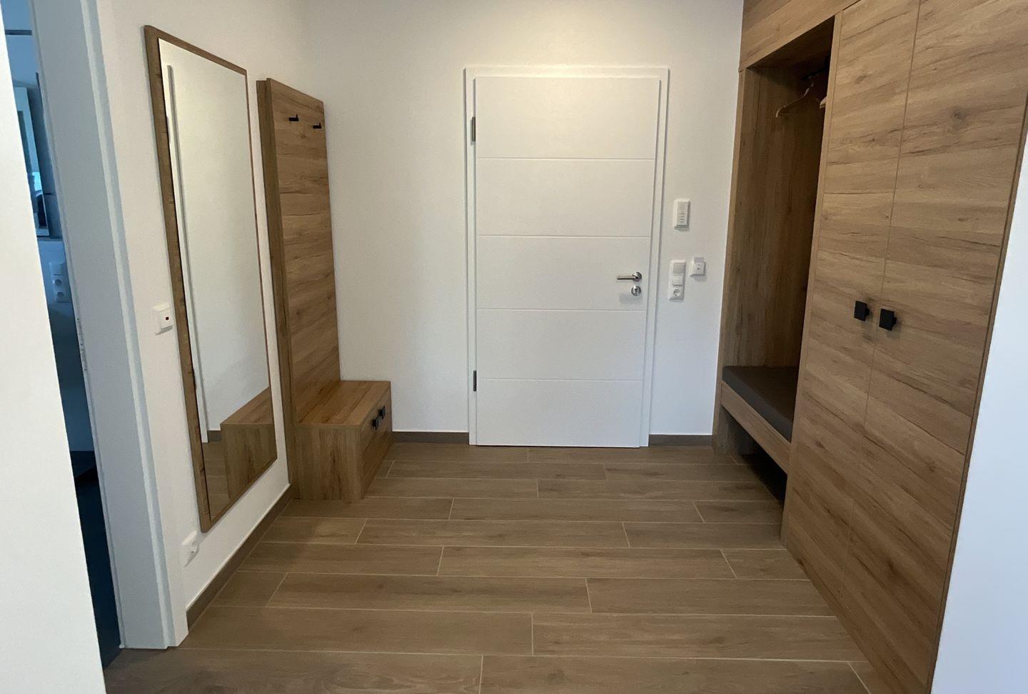 Flur: Aktivierung der Stromzufuhr der Wohnung durch eine Stromkarte. Flur mit Garderobe, Schuh- und Garderobenschrank, Staubsauger