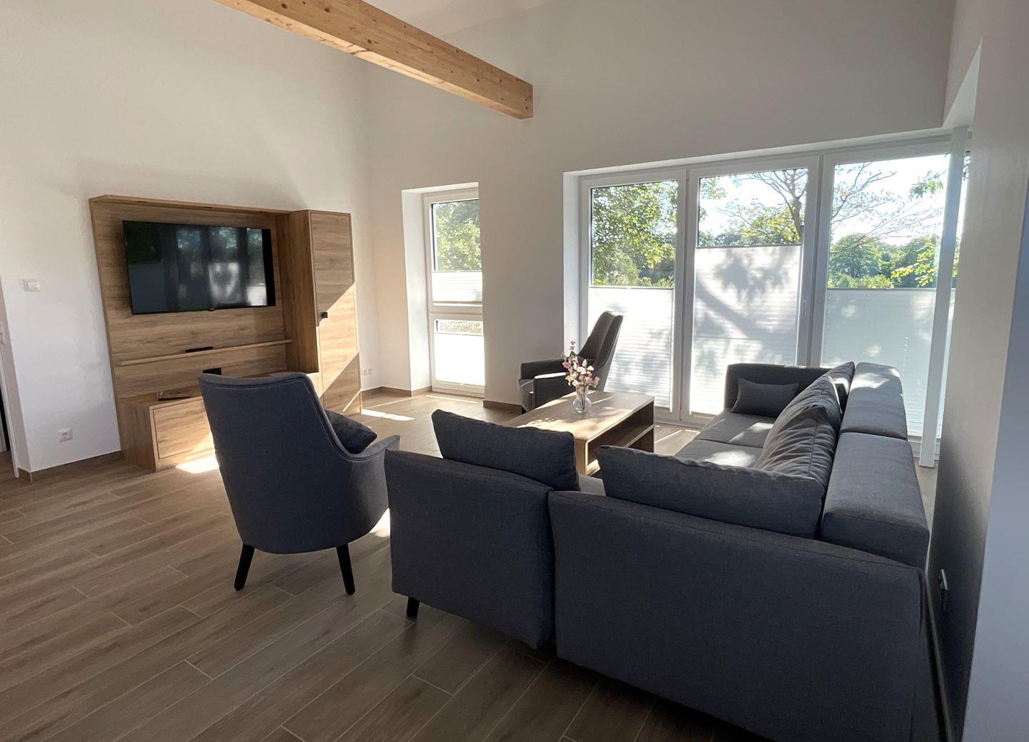 Wohnzimmer: gemütliche Sitzecke mit Sessel, Sofa, Flachbildfernseher, Empfang deutschsprachiger TV-Programme