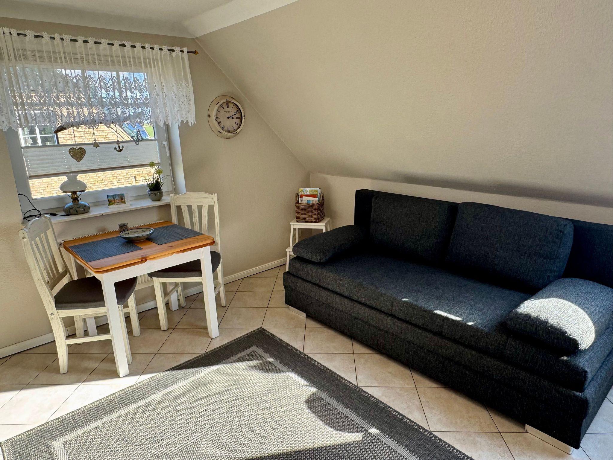 Die, im ersten Stock liegende, Wohnung verfügt über ein ruhiges Schlafzimmer mit TV, ein modernes Duschbad mit Fußbodenheizung sowie ein großzügiges Wohnzimmer mit Smart-TV und - noch zusätzlich zur Couch- einem komfortablem Schlafsofa, falls getrennt geschlafen werden möchte. Die voll ausgestattete Einbauküche lässt keine Wünsche offen und bietet Geschirrspüler, Wasserkocher und Toaster, Herd mit Backofen und Kühlschrank mit Gefrierfach.