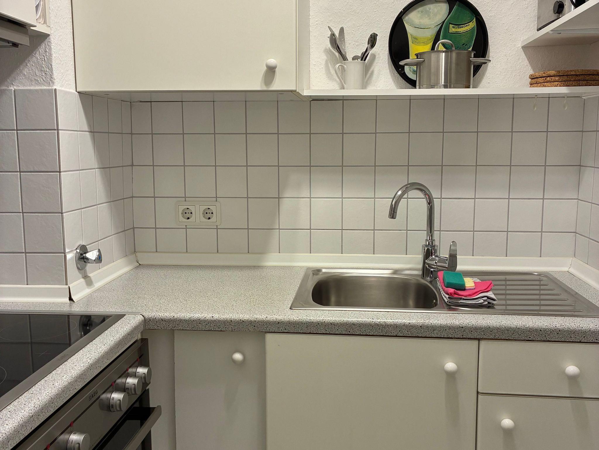 Die funktional gestaltete Küche ist harmonisch in den Wohnraum integriert und eignet sich gut für die Zubereitung eigener Mahlzeiten. Eine Kaffeemaschine sowie eine Gefriermöglichkeit sind vorhanden. Direkt am Fenster befindet sich eine Essecke, die sich ideal für ein entspanntes Frühstück oder einen Kaffee zwischendurch eignet.