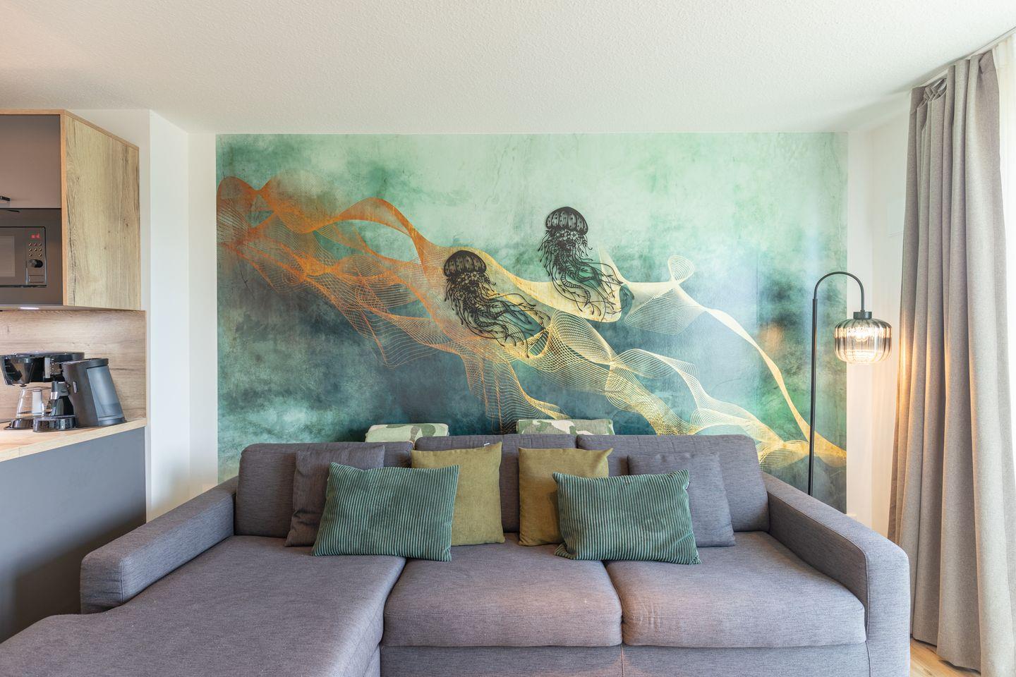 Der offene Wohn- und Essbereich empfängt Sie mit einem stilvollen Interieur, bestehend aus einem gemütlichen Sofa mit Schlaffunktion, komfortablen Sesseln und einem großen TV-Gerät. Geschmackvolle Möbelstücke setzen harmonische Akzente. Für beste Unterhaltung und jederzeitige Vernetzung steht Ihnen selbstverständlich kostenfreies WLAN zur Verfügung.