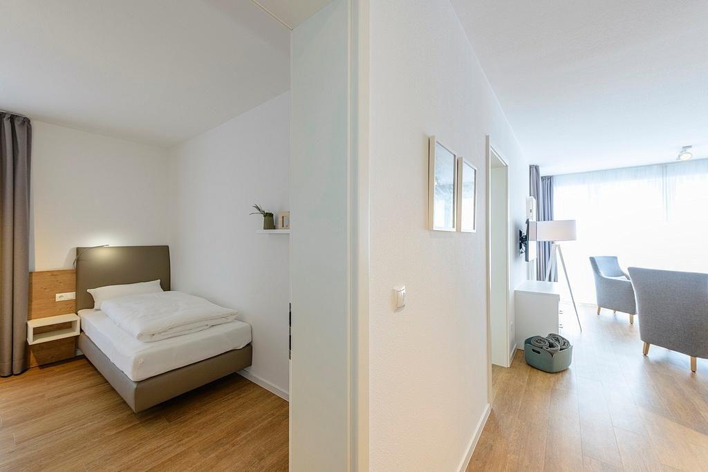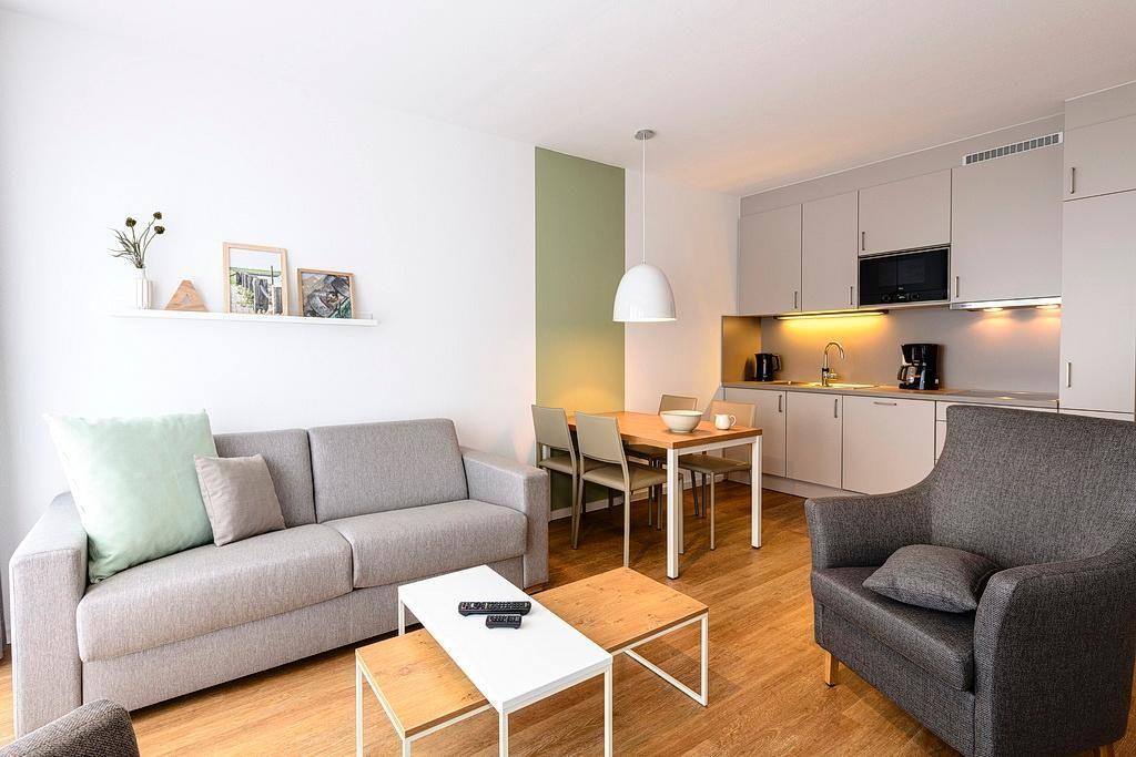 Das geschmackvoll eingerichtete Nichtraucher-Apartment verfügt über kostenfreies WLAN. Der Wohnbereich mit Schlafcouch bietet eine voll ausgestattete offene Küchenzeile mit Geschirrspüler, Gefrierfach, Kaffeemaschine, Toaster, Wasserkocher und Mikrowelle mit Backfunktion sowie einen großen Flatscreen-TV und ein Radio. Das Apartment verfügt über einen Esstisch für 5 Personen und einen behaglichen Sitzbereich. Zwei separate Schlafzimmer stehen euch zur Verfügung. Eines davon verfügt über ein Doppelbett und einen eigenen Flatscreen-TV, ein weiteres Schlafzimmer über zwei Einzelbetten. Ein Kinderbett kann gegen Entgelt aufgestellt werden. Im stilvollen Badezimmer befinden sich eine große begehbare Dusche sowie ein Waschtisch mit Föhn und Kosmetikspiegel. Nach einem erlebnisreichen Urlaubstag entspannt ihr auf der überdachten und mit Gartenmöbeln für 4 Personen ausgestatteten Terrasse. Die Terrasse ist vom Wohnbereich und vom Hauptschlafzimmer aus zugänglich.