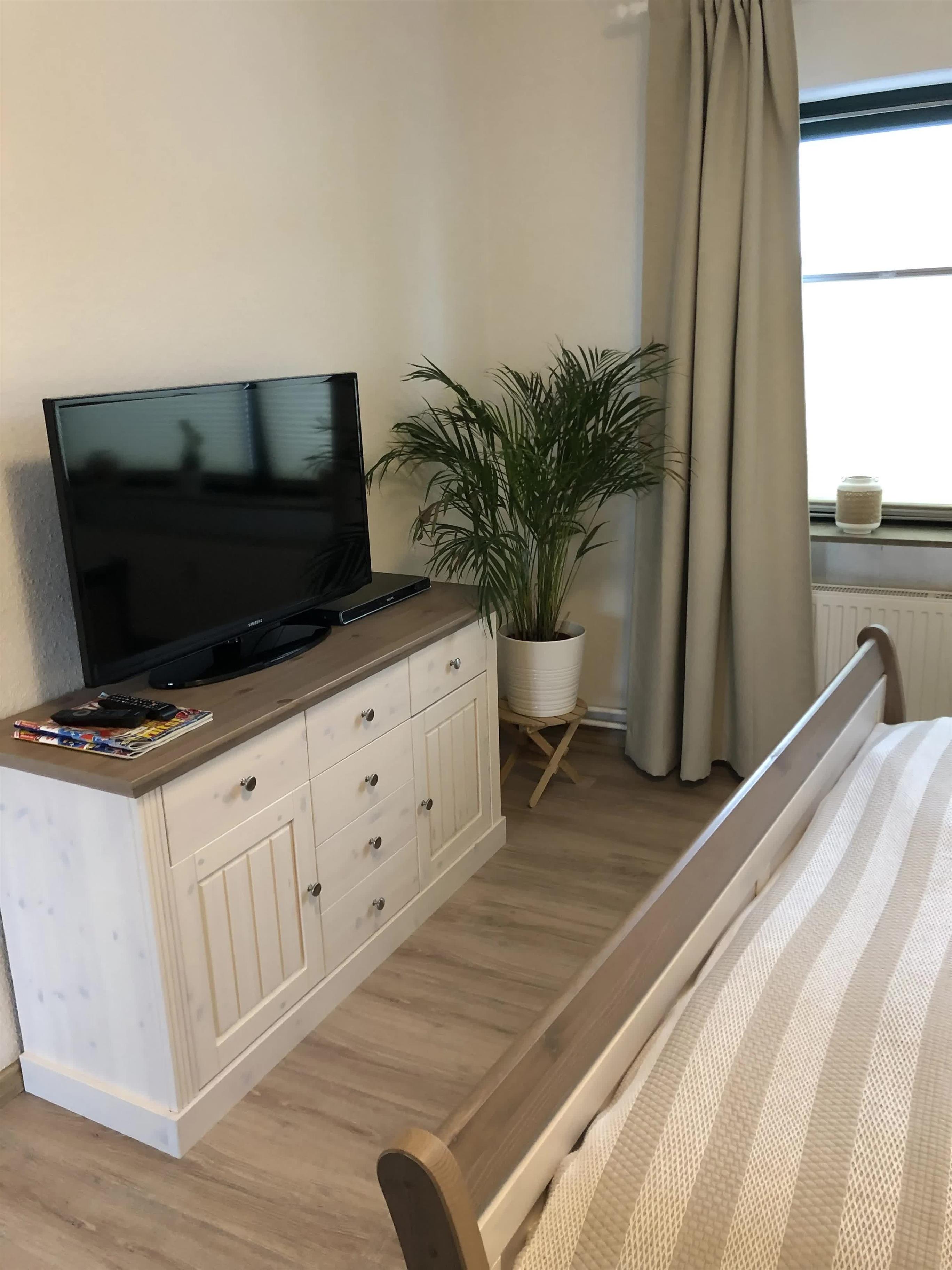 Das Badezimmer grenzt direkt an und ist mit einer Duschkabine, einem WC und einem Waschbecken ausgestattet. Im Schlafzimmer erwartet Sie ein Doppelbett mit zwei separaten Matratzen, ein Flachbildfernseher, zwei Nachttische mit Lampen sowie eine Kommode.