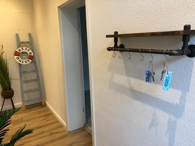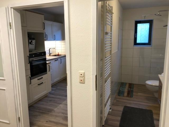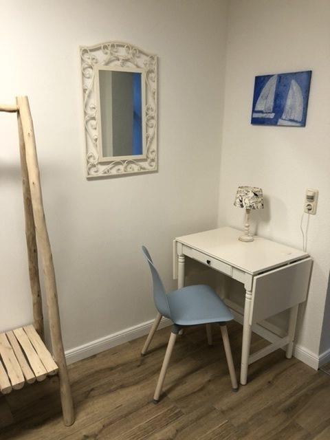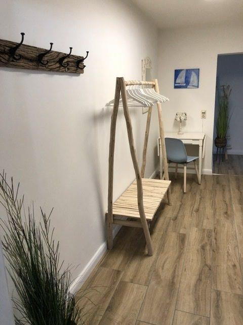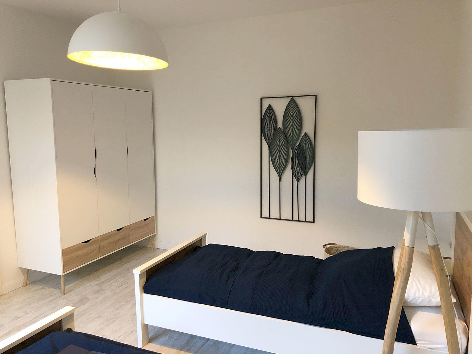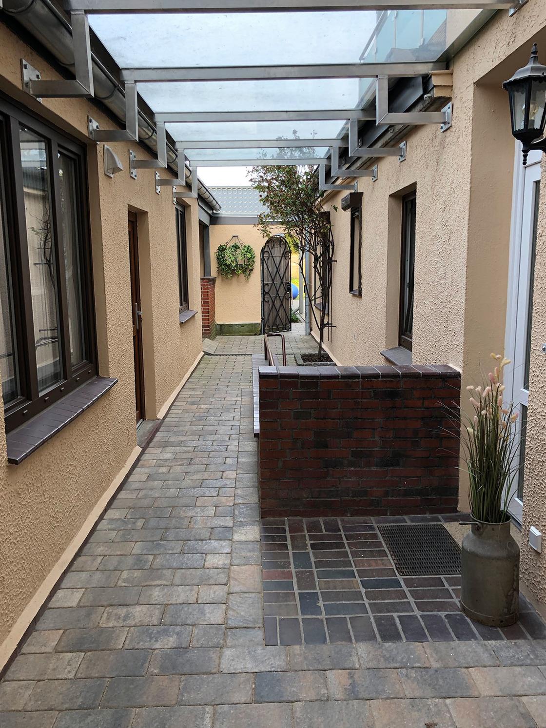 Über den gemeinsam genutzten Haus-Eingangsflur, der zu zwei weiteren Ferienwohnungen (1. Etage) führt, gelangen Sie in den Innenhof-Gang. Von hier aus führt der Wohnungsflur am ersten Schlafzimmer vorbei. Dieses verfügt über zwei Einzelbetten, eine Kommode, Nachttische und einen Kleiderschrank. Ein weiterer Flur führt zur voll ausgestatteten, modernen Küche mit Cerankochfeld, Backofen, Kühlschrank, Geschirrspüler, Mikrowelle, Kaffee-Vollautomat, Toaster und Wasserkocher. Hier gibt es auch eine gemütliche Sitzecke für zwei Personen.