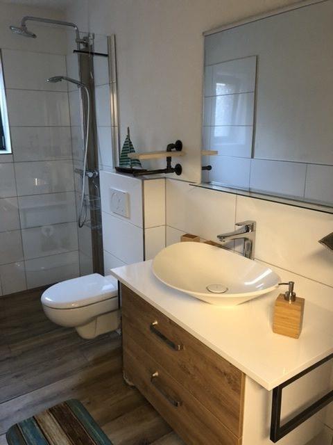 Das angrenzende Badezimmer verfügt über eine ebenerdige Dusche, ein WC und ein Waschbecken. Das Wohnzimmer bietet einen schönen Blick in den Garten und ist mit einer gemütlichen Eckcouch, einem Flachbild-TV und einem großzügigen Esstisch für 4-6 Personen ausgestattet. Das zweite Schlafzimmer grenzt direkt an und hat ein 2 Meter breites Doppelbett, zwei Nachttischen mit Lampen, eine Kommode und einen Kleiderschrank.