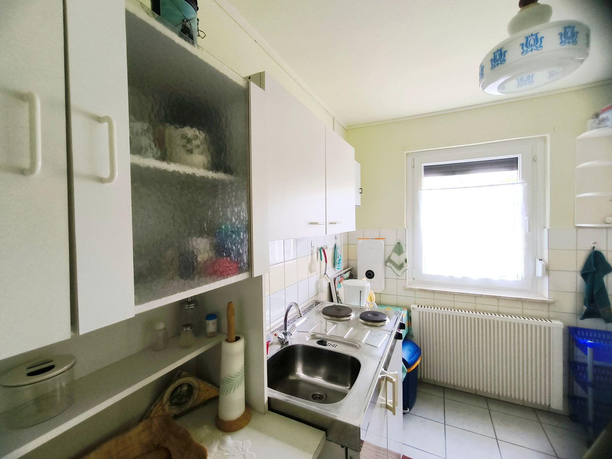 Die separate Küche ist funktional und gut ausgestattet mit einem 2-Platten-Elektroherd, einem Kühlschrank mit Tiefkühlfach und einer kleinen Essecke.