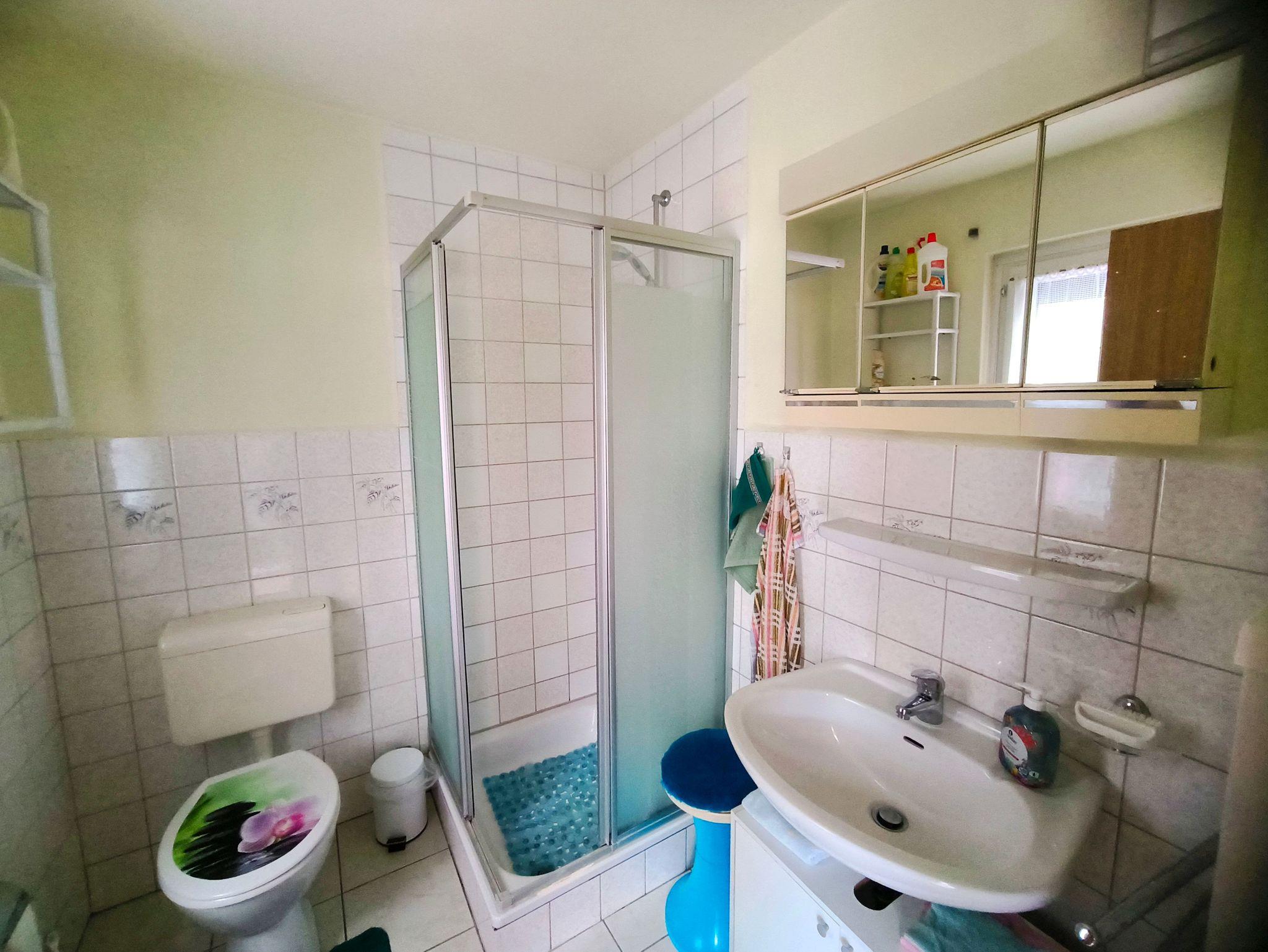 Das Badezimmer verfügt über eine Dusche und WC, sodass Sie sich nach einem aktiven Tag erfrischen können.