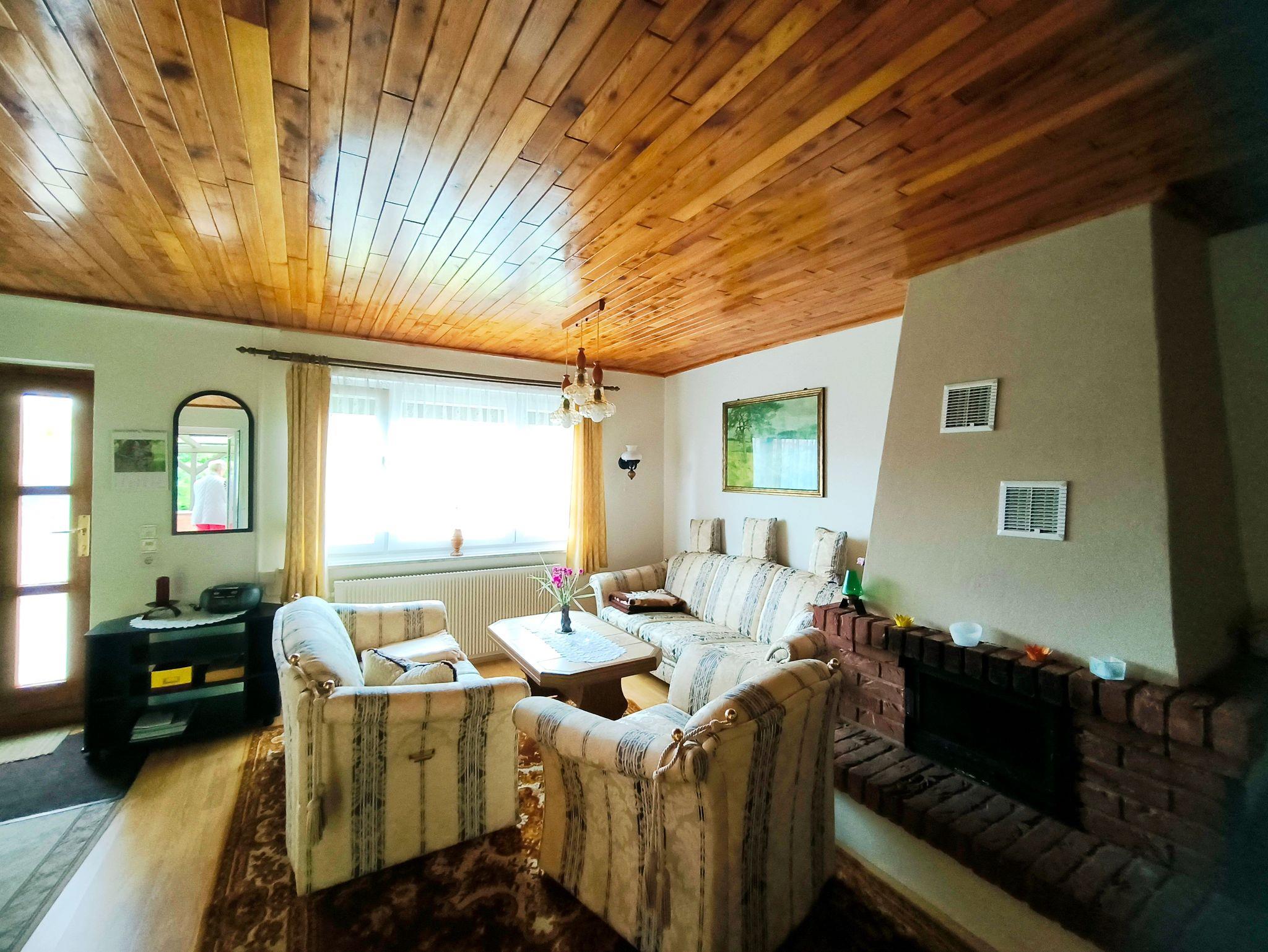 Willkommen in Ihrer gemütlichen Ferienwohnung, die Ihnen einen perfekten Rückzugsort für entspannte Tage bietet! Im Erdgeschoss erwartet Sie ein einladendes Wohnzimmer, das mit einem Kamin für wohlige Wärme sorgt. Hier können Sie es sich auf der bequemen Eckcouch oder im Sessel mit einem guten Buch gemütlich machen. Außerdem bietet einen Anbauwand - bestückt mit einer Spieleauswahl - Stauraum und zusätzlichen Komfort.