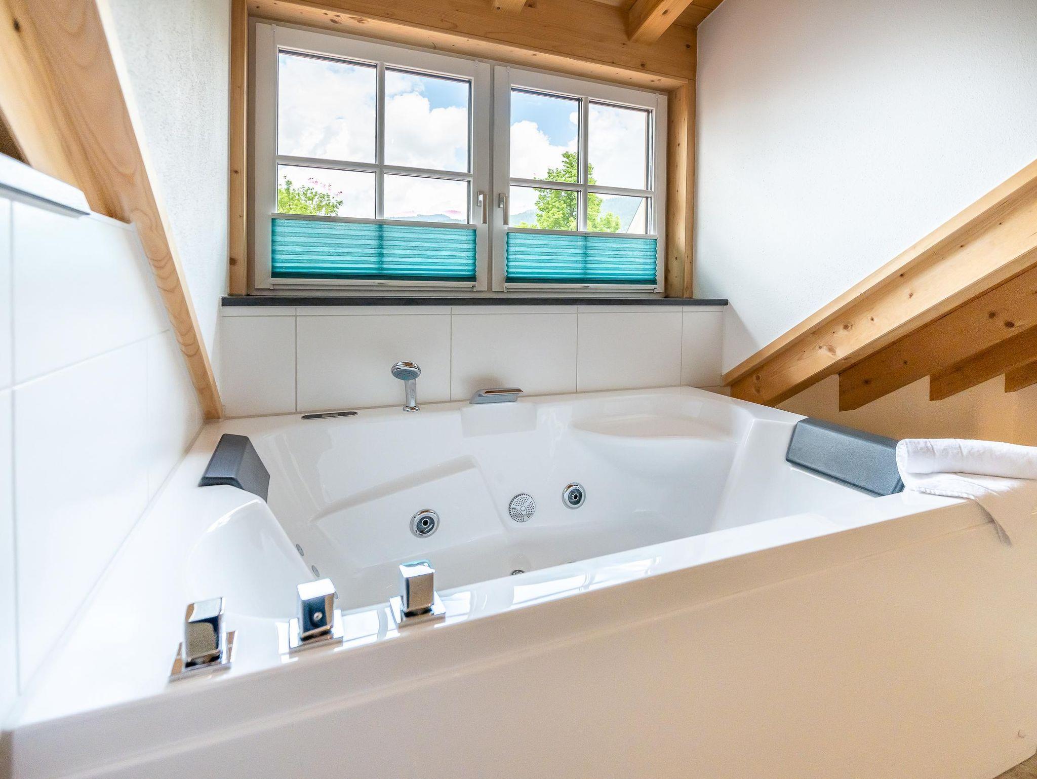 • Badezimmer mit WC, Waschtisch, ebenerdiger Dusche und Whirl-Wanne mit Panoramablick für 2 Personen