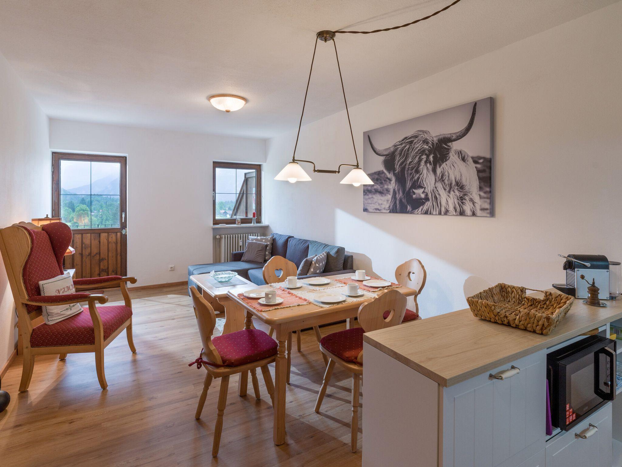 Neurenovierte 2-Zimmer Ferienwohnung im Erdgeschoss mit separatem Schlafzimmer mit Doppelbett, Bad, mit begehbarer Dusche sowie Toilette. Das Wohn-, Esszimmer ist mit einem Schlafsofa für 2 Personen ausgestattet. Die Küchenzeile bietet eine Spülmaschine, 2-Platten-Herd, Filterkaffeemaschine sowie Geschirr, Besteck und Kochutensilien. Der Balkon mit Blick in die umliegende Bergwelt lädt zum Verweilen ein. Bettwäsche, Handtücher und Geschirrtücher sind inklusive. Es stehen Ihnen zur allgemeinen Nutzung eine Sauna, Fitnessraum, Spielezimmer und ein Skikeller zur Verfügung.