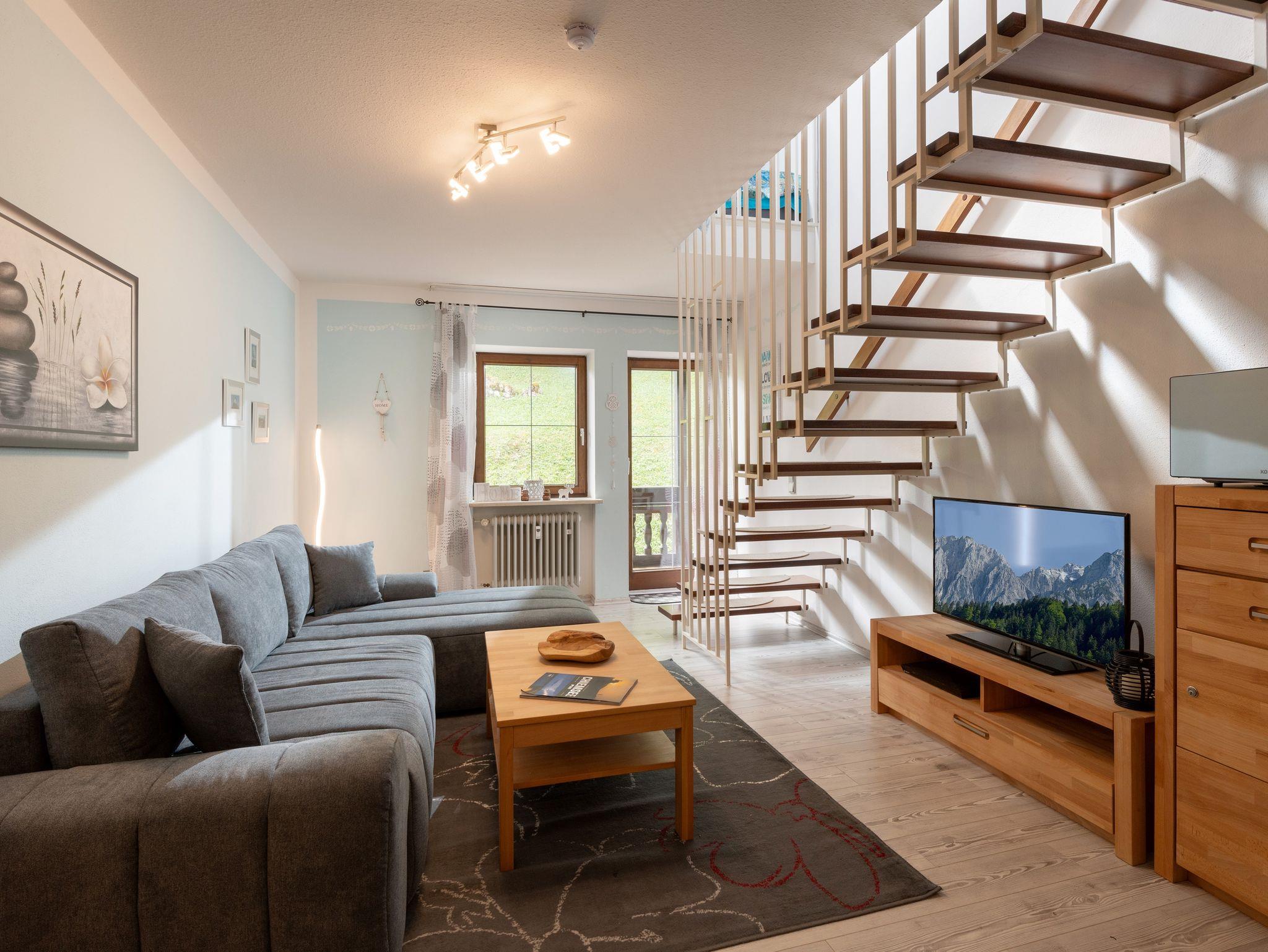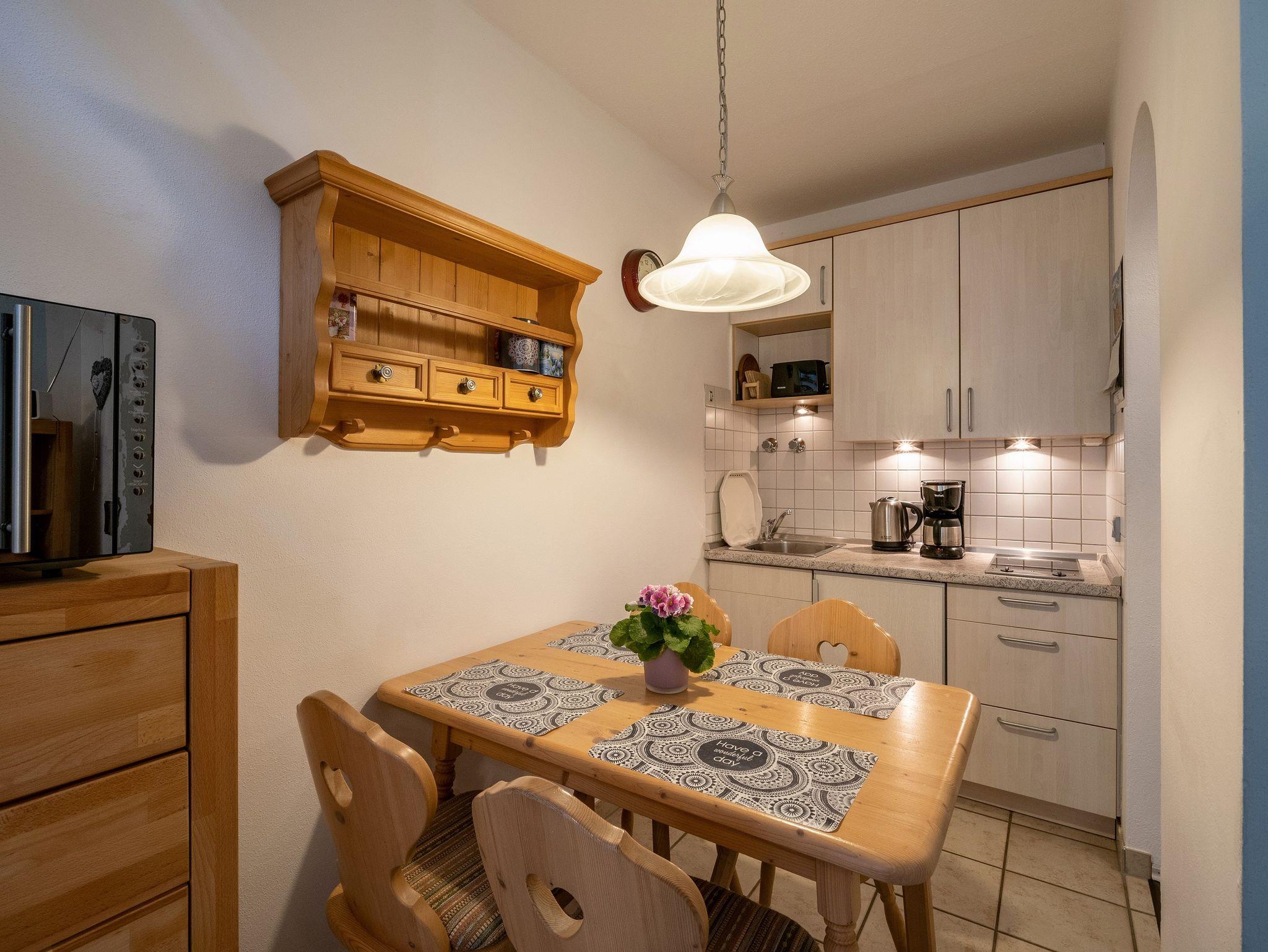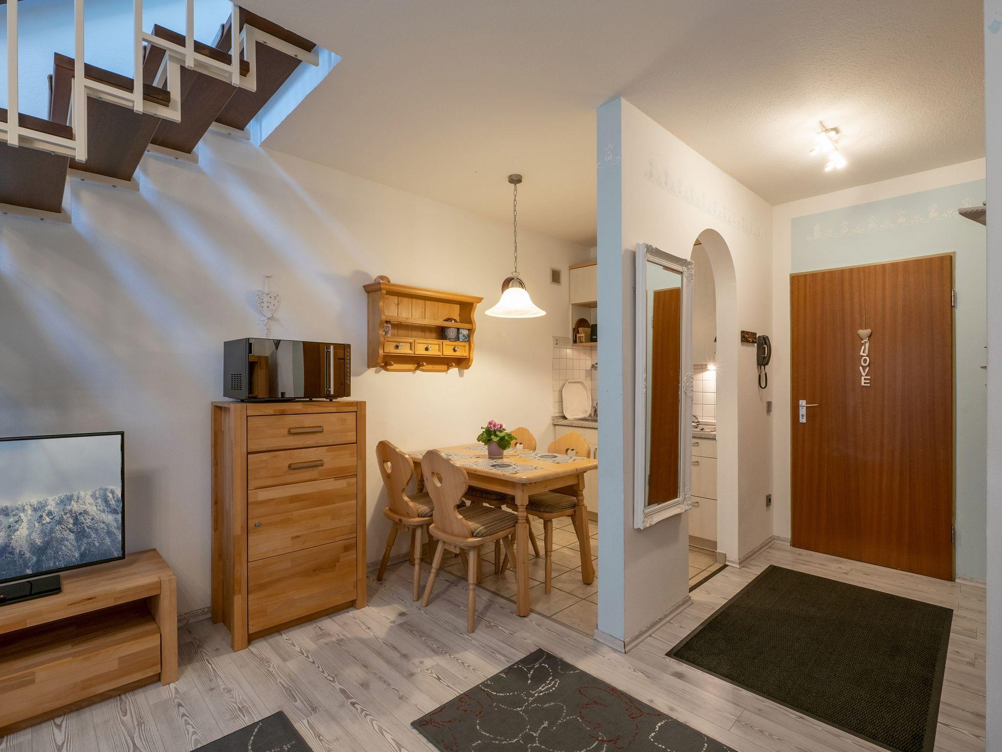 Die gemütliche Maisonettewohnung verfügt über ein großes Wohnzimmer mit Flachbildfernseher und einer Ausziehcouch sowie eine Küchenzeile mit einer Spülmaschine und einer Mikrowelle sowie einem 2-Plattenherd. Ausgestattet ist die Küchenzeile außerdem mit Geschirr, Besteck, Gläser sowie alle nötigen Kochutensilien. Der Essbereich ist in den Wohnbereich integriert. Das Badezimmer hat eine Badewanne, das WC ist separat. Das Schlafzimmer befindet sich im oberen Stockwerk. Dort ist auch das Badezimmer. Der Balkon mit herrlichem Blick über Oberaudorf und auf das Kaisergebirge lädt zum Verweilen ein.
