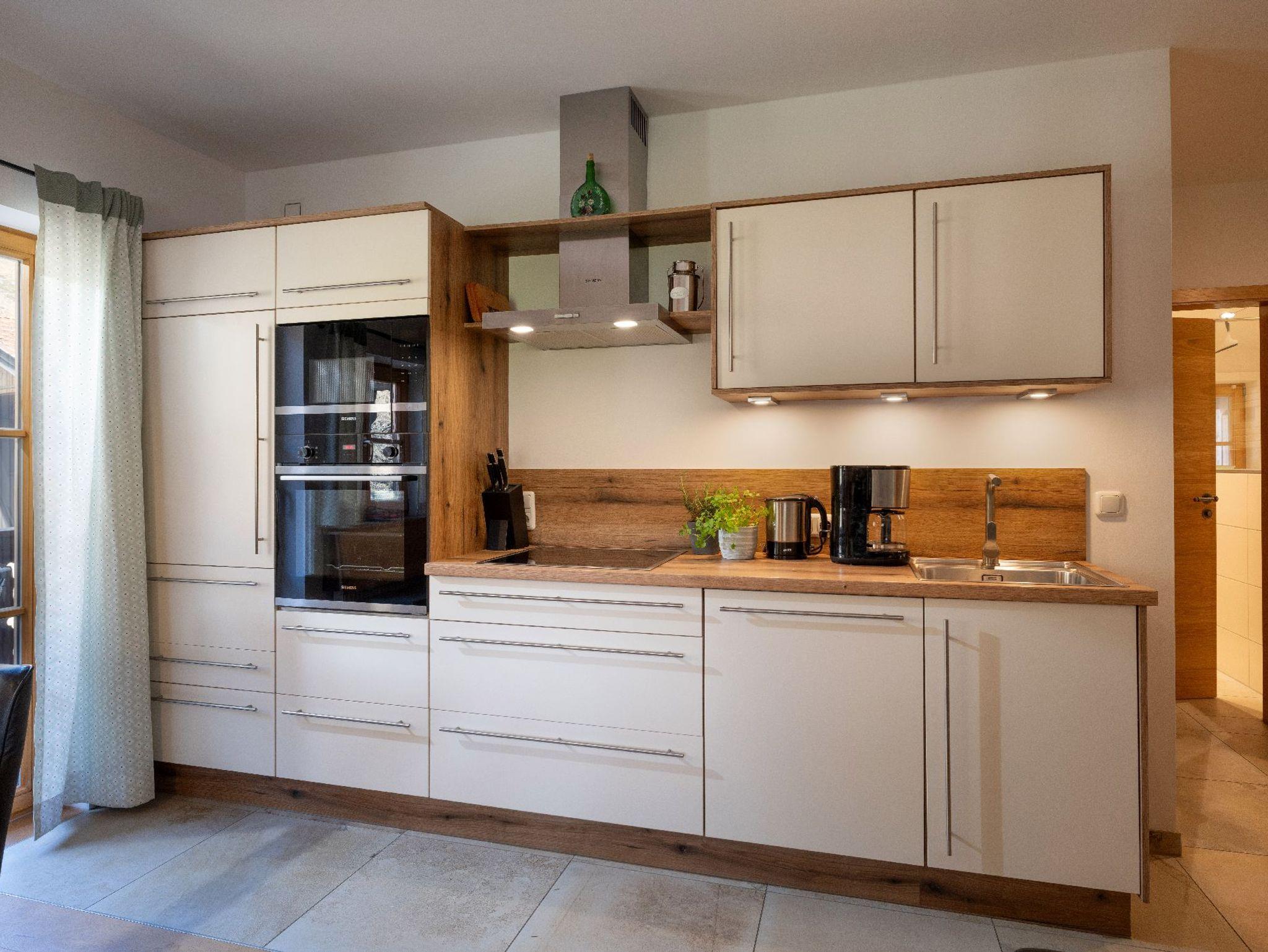 Die gemütliche Wohnküche ist der ideale Ort zum Kochen, Genießen und Beisammensein – mit einer einladenden Sitzecke und voll ausgestatteter Küche. Das Schlafzimmer wurde komplett neu vom Schreiner mit duftendem Fichtenholz gefertigt und verspricht erholsame Nächte in natürlicher Atmosphäre.