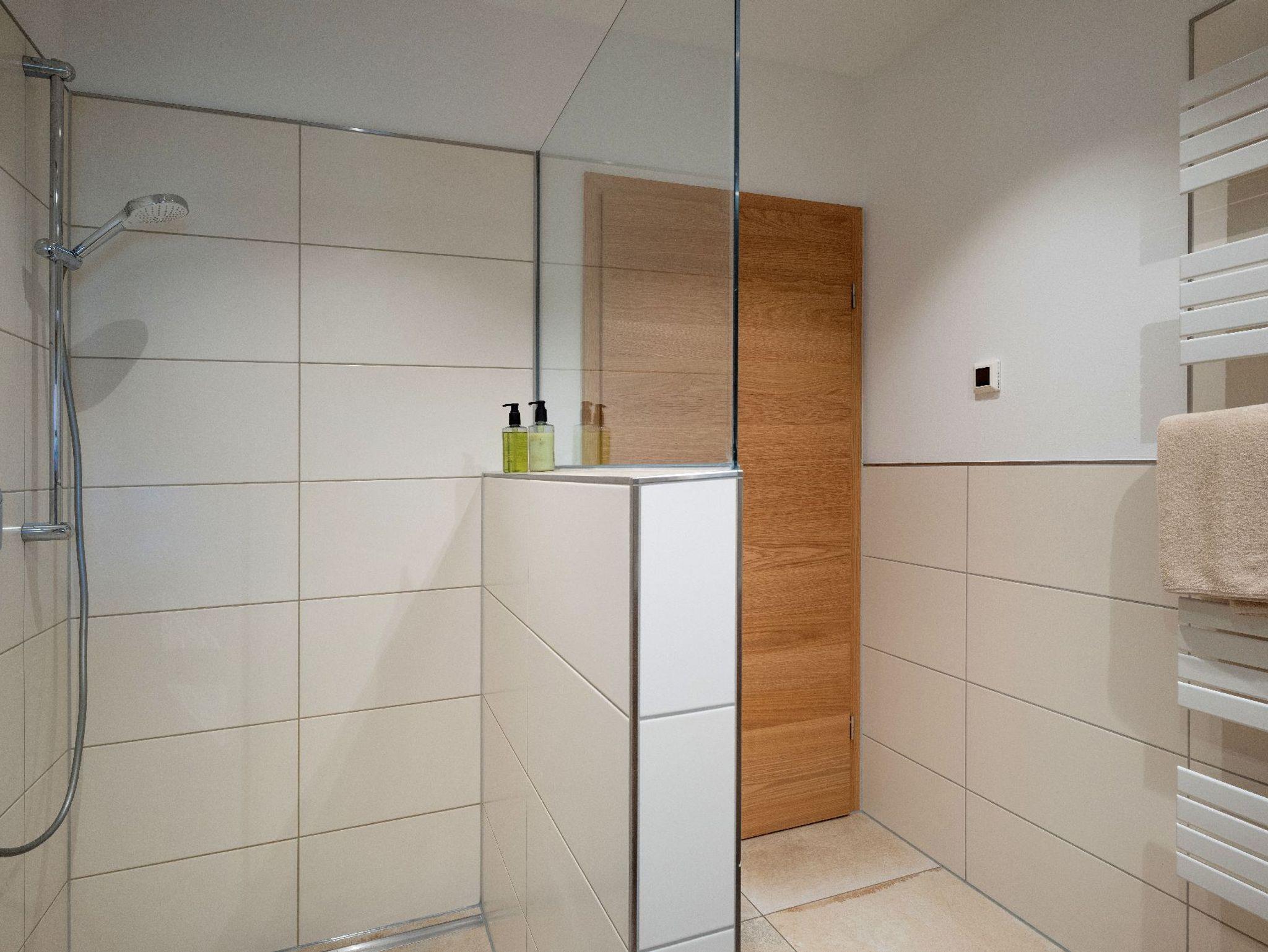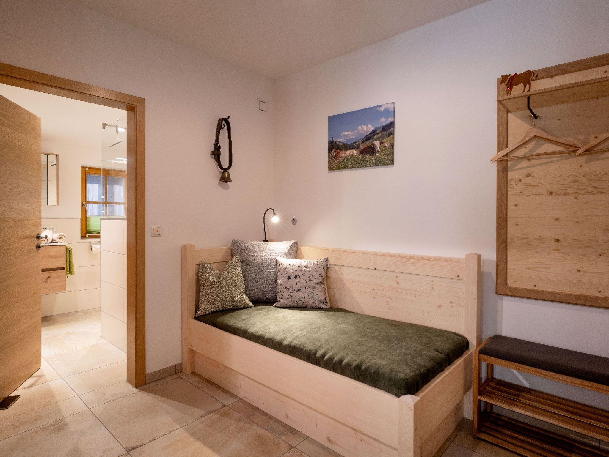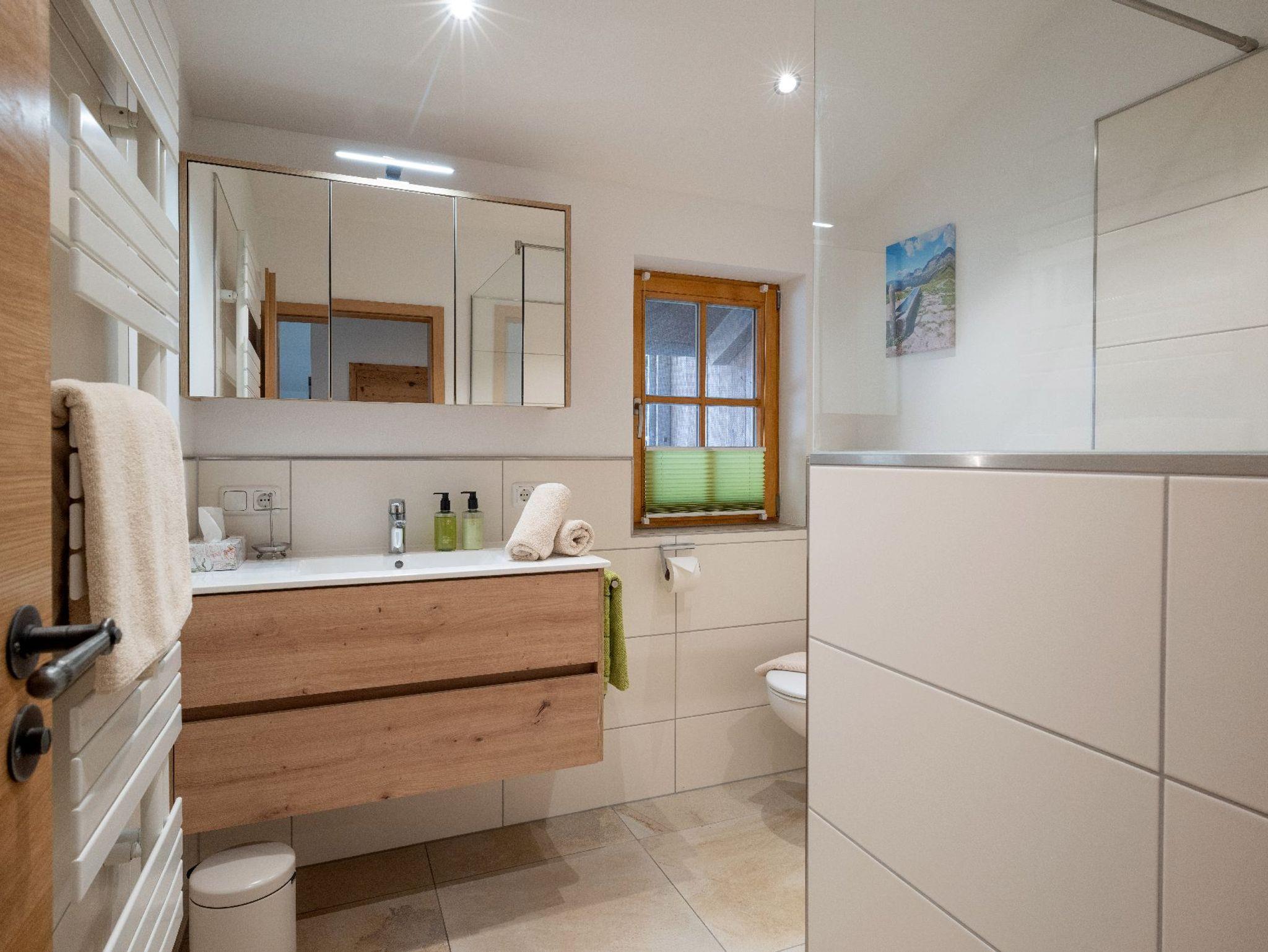 Das großzügige Bad bietet viel Platz, Tageslicht und modernen Komfort. Ein zusätzliches Bett für ein Kind ist ebenfalls vorhanden – perfekt für Familien.