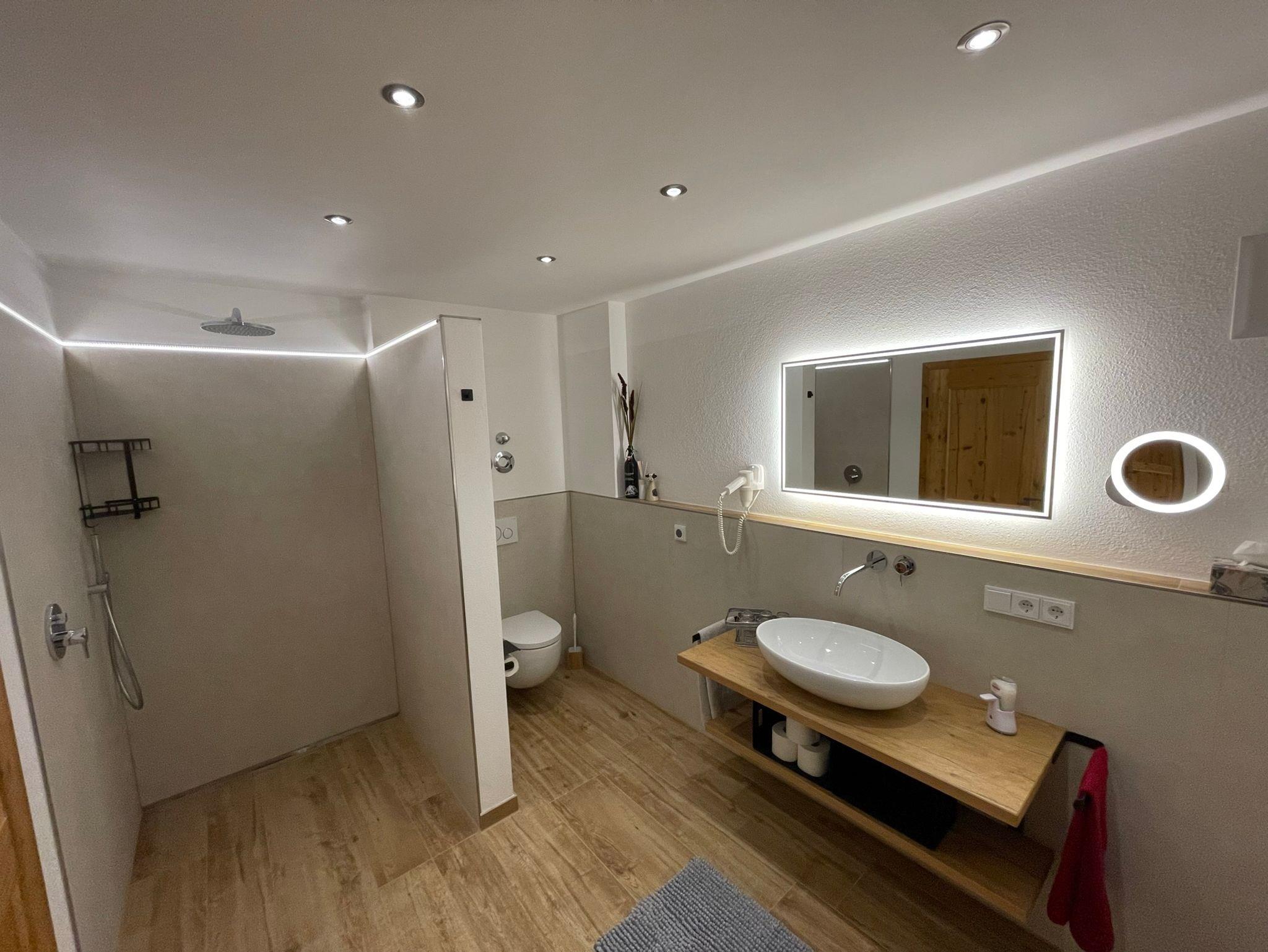 Unsere FeWo Brünnstein liegt im Dachgeschoss des Hauses und hat ca. 75 qm. In der gesamten Wohnung wurde ein Sichtdachstuhl mit elektrischen Dachfenstern verbaut. Sie verfügt über ein großes Elternschlafzimmer mit Doppelbett und TV, sowie über ein separates Schlafzimmer mit 2 Einzelbetten. Ein großer Wohn- & Essbereich mit integrierter Küche ist in der Wohnung ebenfalls zu finden. Dort ist ein TV mit großer Schlafcouch, ein Essplatz für 6 Personen und eine vollausgestattete Küche. Im Badezimmer finden Sie eine Regendusche mit LED-Beleuchtung, Föhn und Kosmetikspiegel sowie einen Handtuchtrockner. Der großzügige Eingangsbereich der Wohnung bietet Platz für eine Garderobe und weitere Schränke zur Aufbewahrung Ihrer persönlichen Dinge. Zusätzlich dürfen Sie unseren Skiraum im EG nutzen und erhalten einen kostenlosen WLAN-Zugang. Für Ihr Auto ist ein Stellplatz direkt vor dem Haus reserviert.