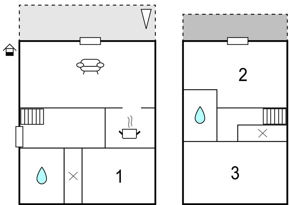 I husets underste etage er der stue, køkken, badeværelse og et soveværelse. Til første sal med soveværelser med hhv to og tre senge, smat et badeværelse er der adgang ad en åben trappe af sten.
