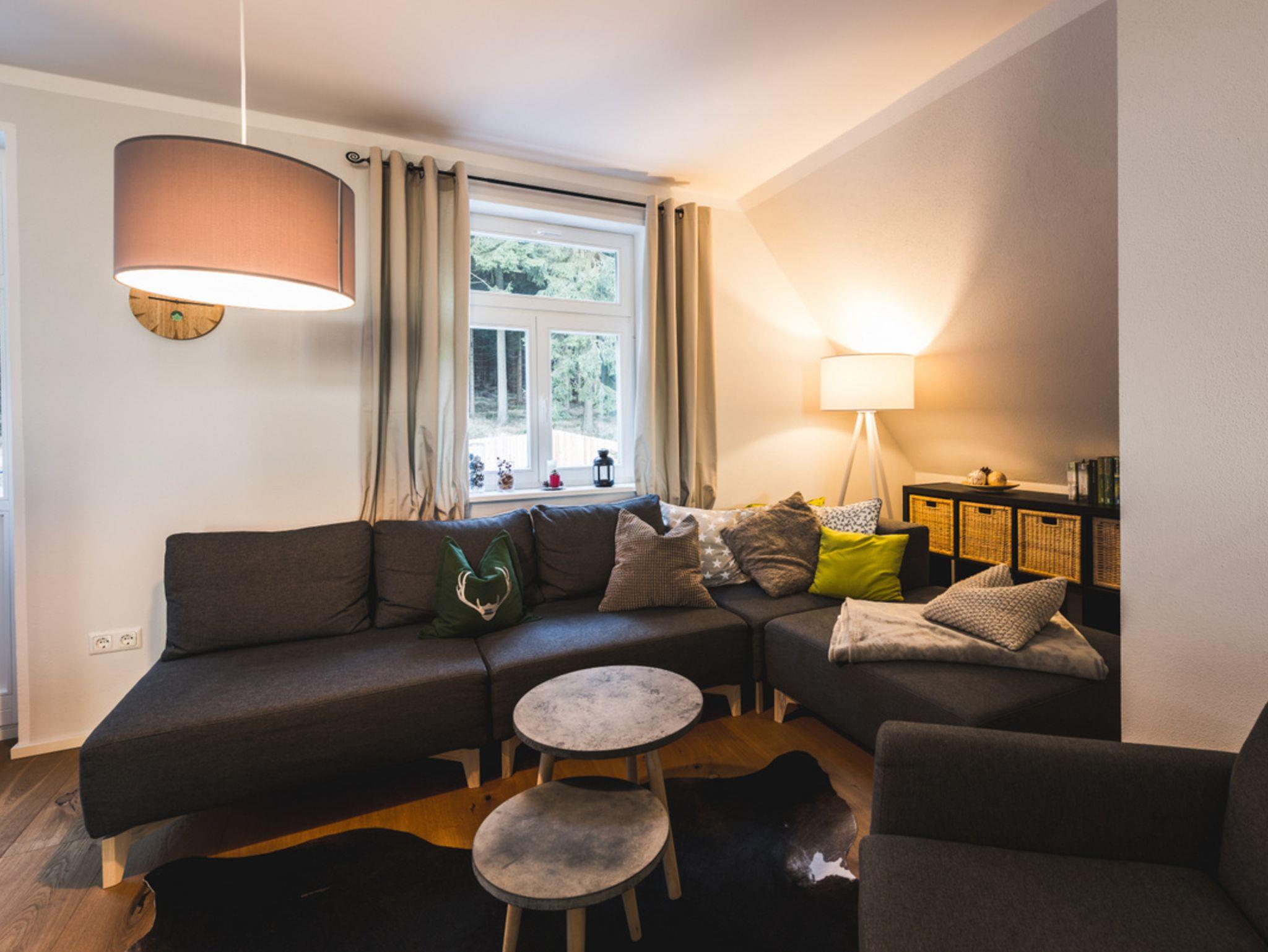 Dieses Ferienappartement ist purer Wohngenuss und bietet auf insgesamt 95 Quadratmetern viel Platz zum gemeinsamen Spielen mit den Kindern. Der gemütliche Wohnbereich mit Kamin grenzt an den großzügig und offen gestalteten, modernen Koch- und Essbereich. Von hier aus können Sie den Ausblick über das Erzgebirge Richtung Elbtal genießen und unter der großzügigen farblich beleuchteten Wellnessdusche alle Sorgen des Alltags vergessen. Die zwei getrennten Schlafzimmer mit Doppelbett sind Rückzugsort für jeden und laden zum Entspannen und Träumen ein.
