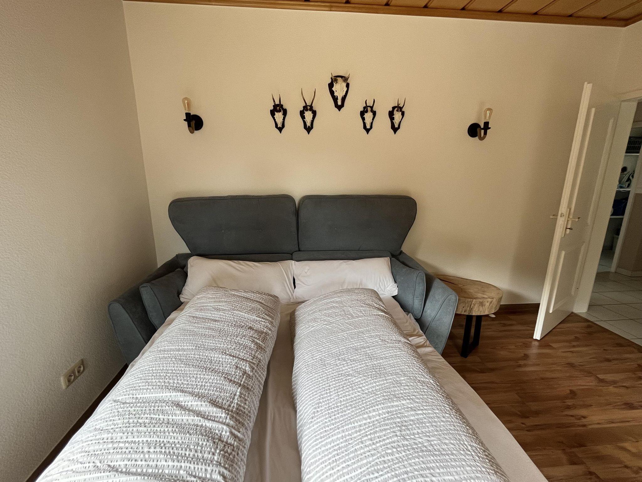Schlafzimmer mit Doppelbett (2 Matratzen, Liegefläche 180x200 cm), auf Wunsch kann ein Kinderbett gestellt werden, großer Einbaukleiderschrank.