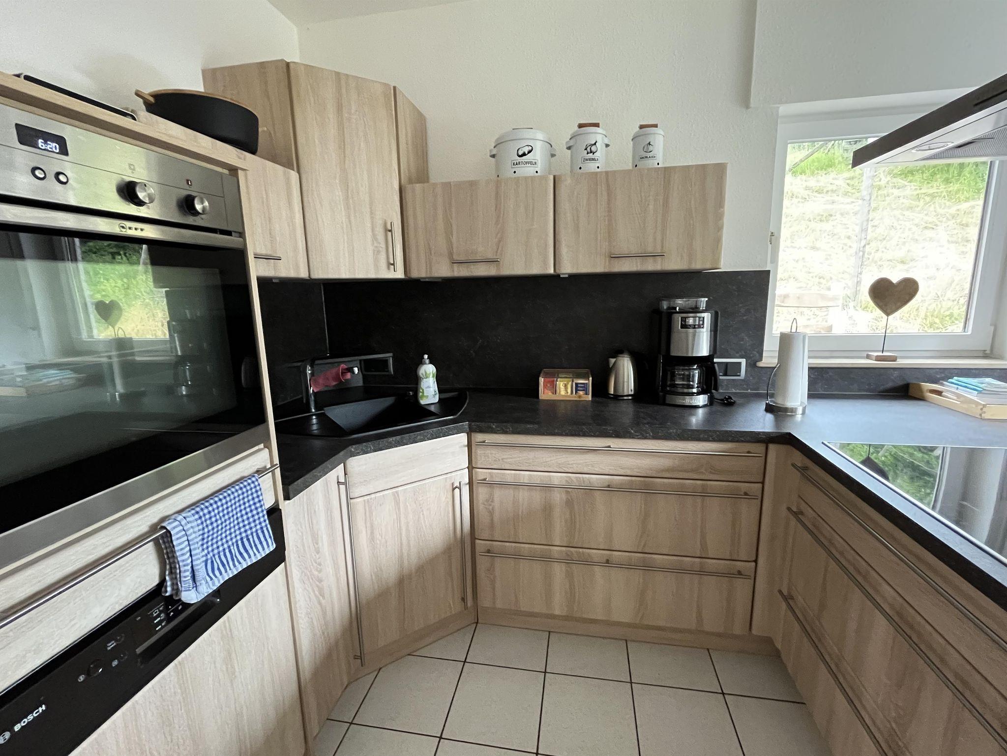 Voll ausgestattete Küche mit hochwertigen Elektrogeräten, Spülmaschine, Cerankochfeld, erhöhter Backofen, Side-by-side-Kühlschrank mit Gefriermöglichkeit, Kaffeemaschine, Wasserkocher, Toaster, Mixer, Radio.