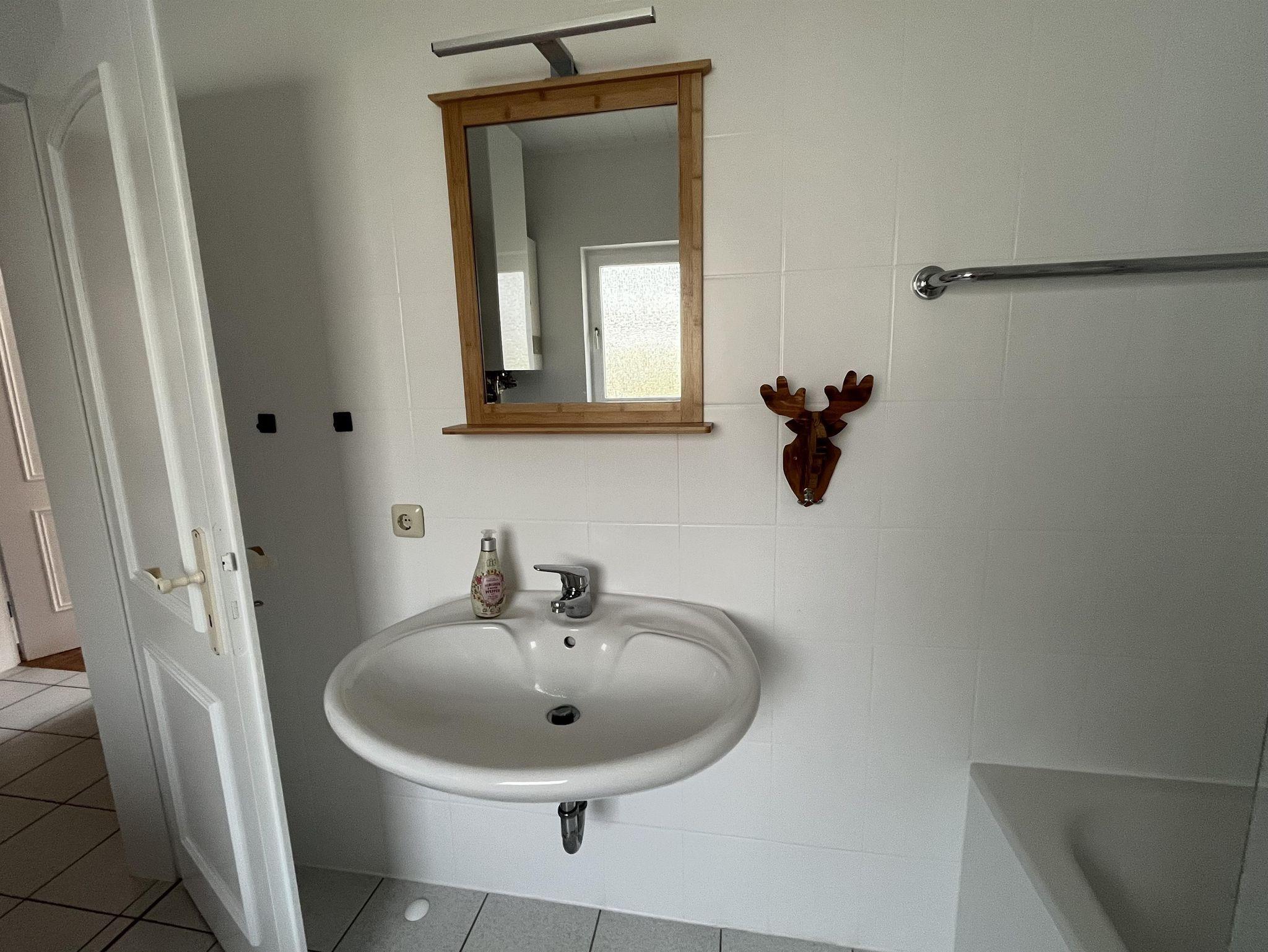 Badezimmer mit Badewanne mit Wannendusche, WC, Waschmaschine, Trockner, Haarföhn.