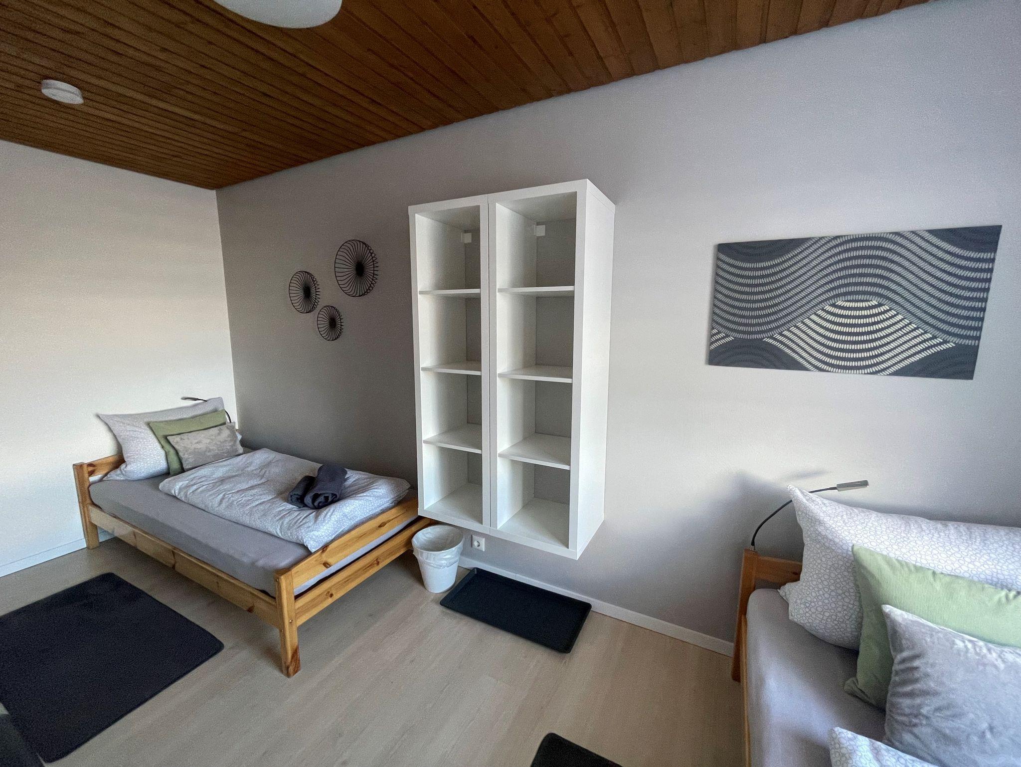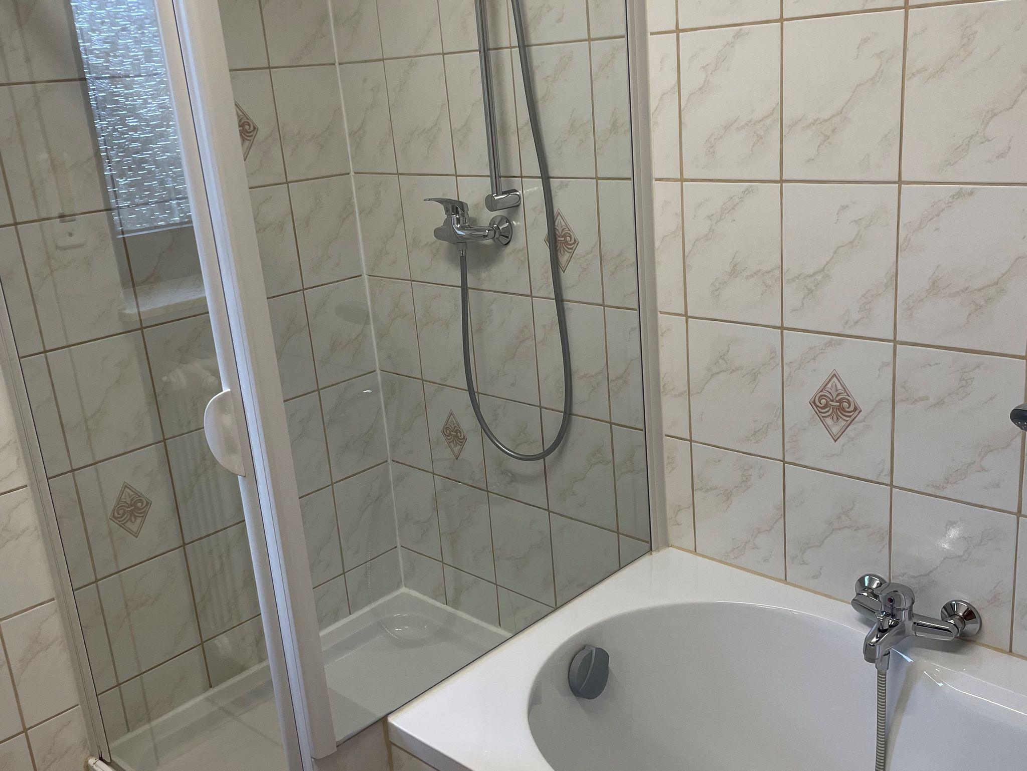 Im Kellergeschoss, das direkt über eine Treppe in der gemieteten Wohnung erreicht wird stehen 3 Duschen mit WC und ein grosses Schlafzimmer mit einem Doppelbett bereit.