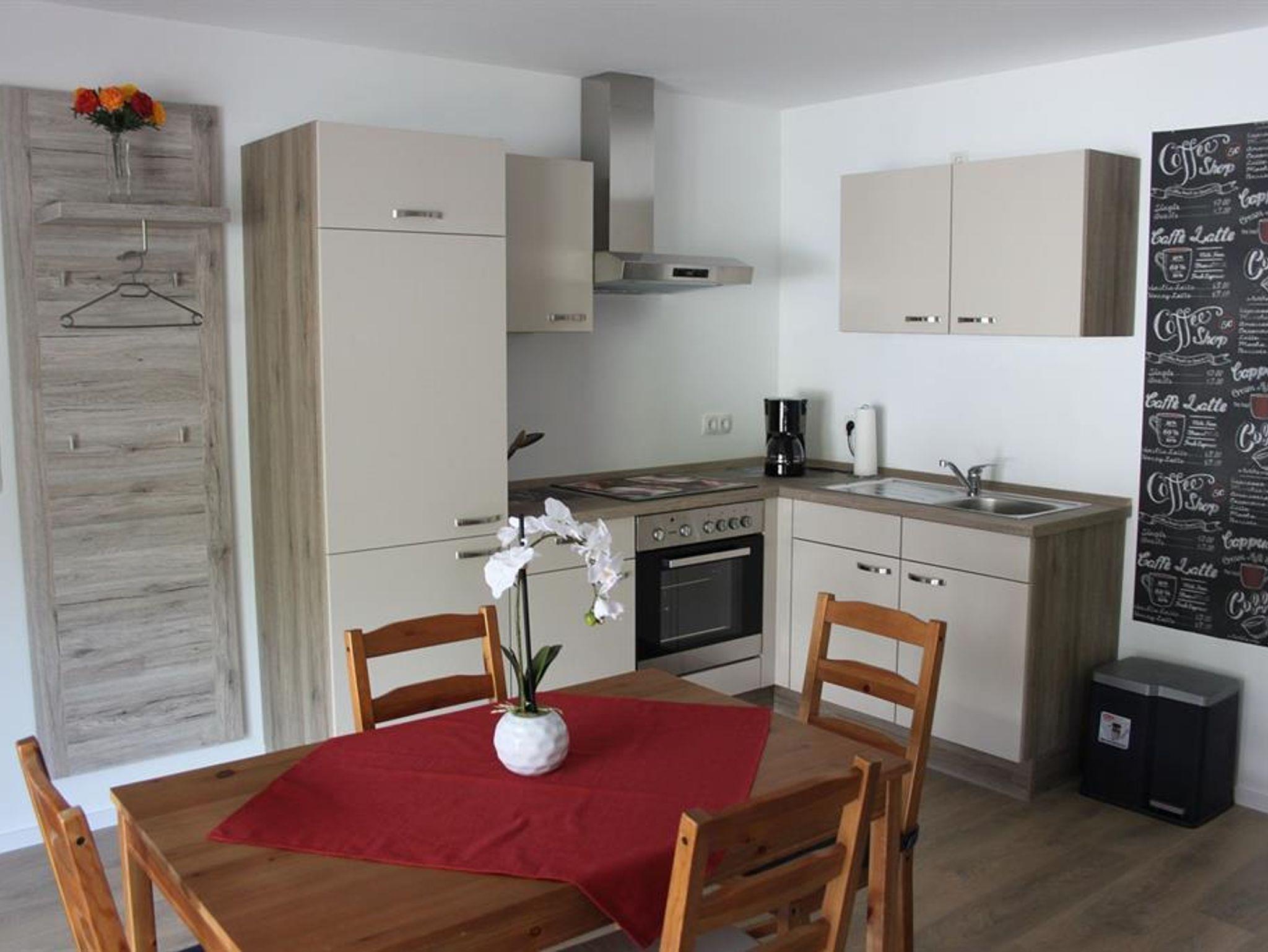 Die neue Küche ist mit Backofen, Cerankochfeld, Kühl- und Gefrierschrank, Kaffeemaschine, Toaster, Wasserkocher und Mikrowelle ausgestattet. Spülmittel, Müllbeutel, Backpapier und Filtertüten sind vorhanden.