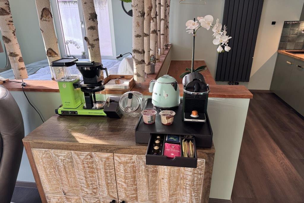 Vores suitelejlighed ligger i stueetagen og er ideel til to personer. Du sover i en stor kingsize-boxmadras, som kan adskilles til to enkeltsenge takket være to separate boxe. Lejligheden er luksuriøst møbleret og blev fuldstændig ombygget i 2025. Udover aircondition og et fuldt udstyret køkken tilbyder vi også mange ekstra faciliteter. Se billederne for detaljer. Du kan checke ind kontaktløst døgnet rundt i hele bygningen ved hjælp af vores Nuki-tastatur og pinkode.