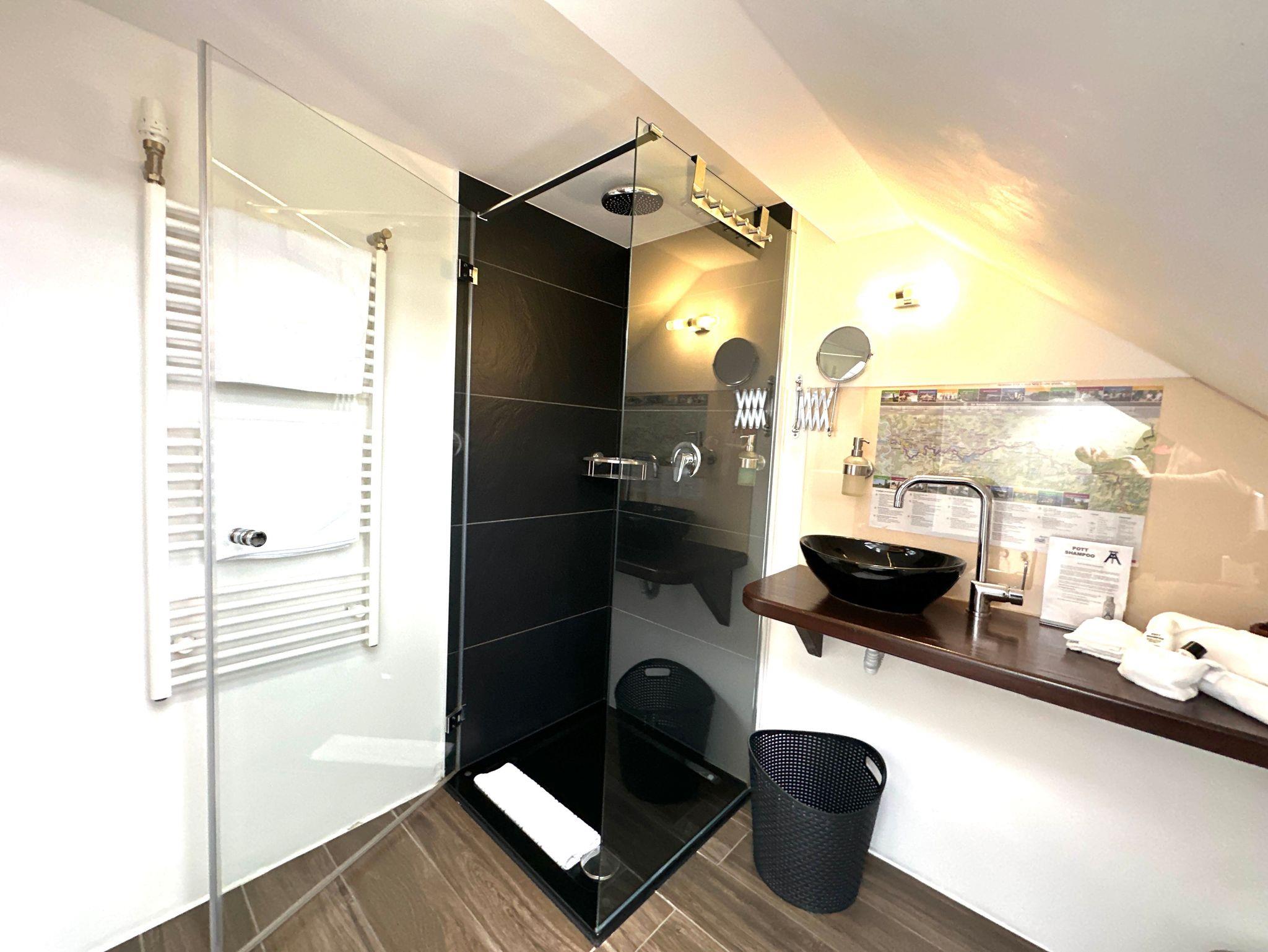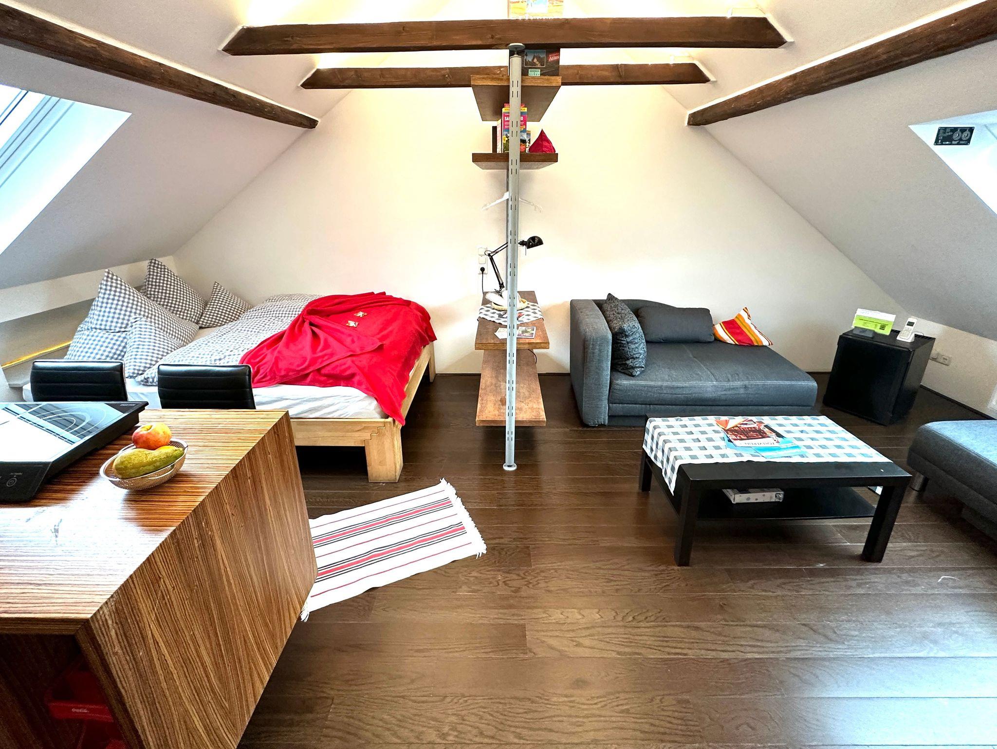 Das Besondere an der 25 m² großen Dachgeschosswohnung ist ihr freundliches sonniges Flair. Sie bietet für alles, was man für einen angenehmen Aufenthalt braucht: ein gemütliches Wohn-/Schlafzimmer mit einem 140x200 Bett, SAT-TV, kleiner Küchenzeile mit allem Notwendigem ausgestattet und ein Duschbad mit Waschbecken und Toilette. Die Wohnung bietet Platz für max. 3 Personen, durch eine zusätzliche Schlafcouch.