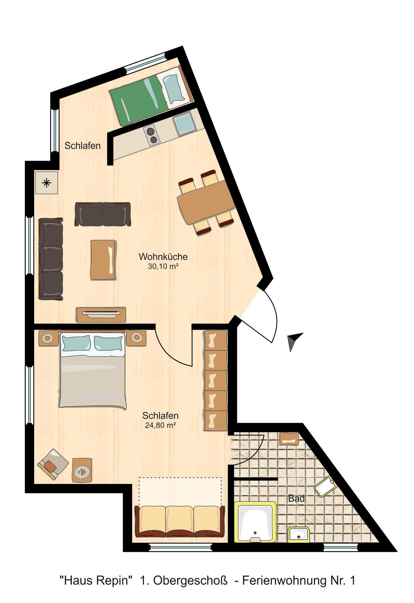 Auf etwa 60 qm bietet Ihnen unsere Ferienwohnung 1 reichlich Platz für 2 bis max. 4 Personen (+ Kinderbett). Das Apartment ist modern und komfortabel mit hochwertigen Stoffen (z.B. Bettwäsche teilweise aus Maco-Satin) und neuesten Medien ausgestattet und befindet sich im 1. Obergeschoss des Haus Repin.