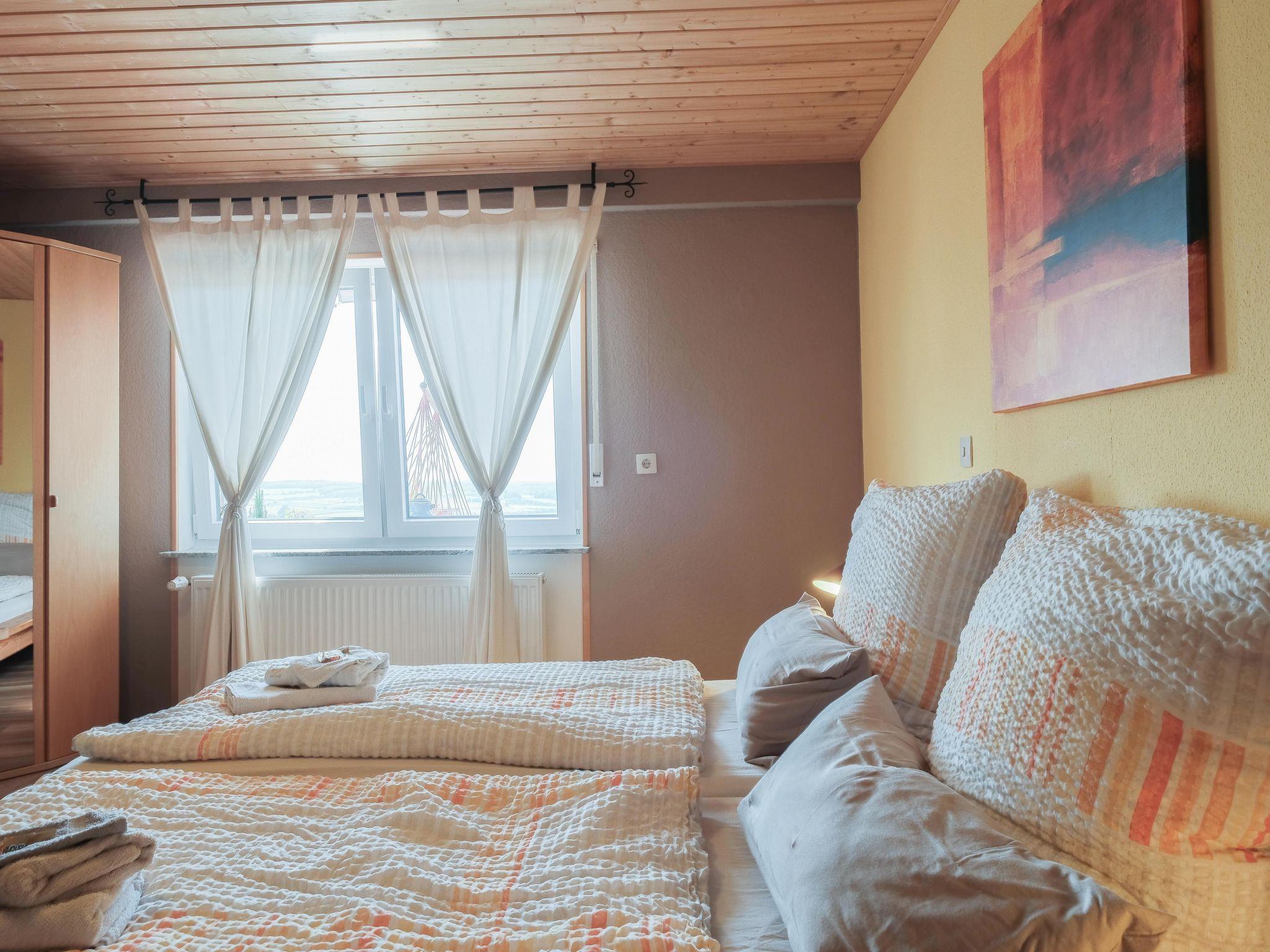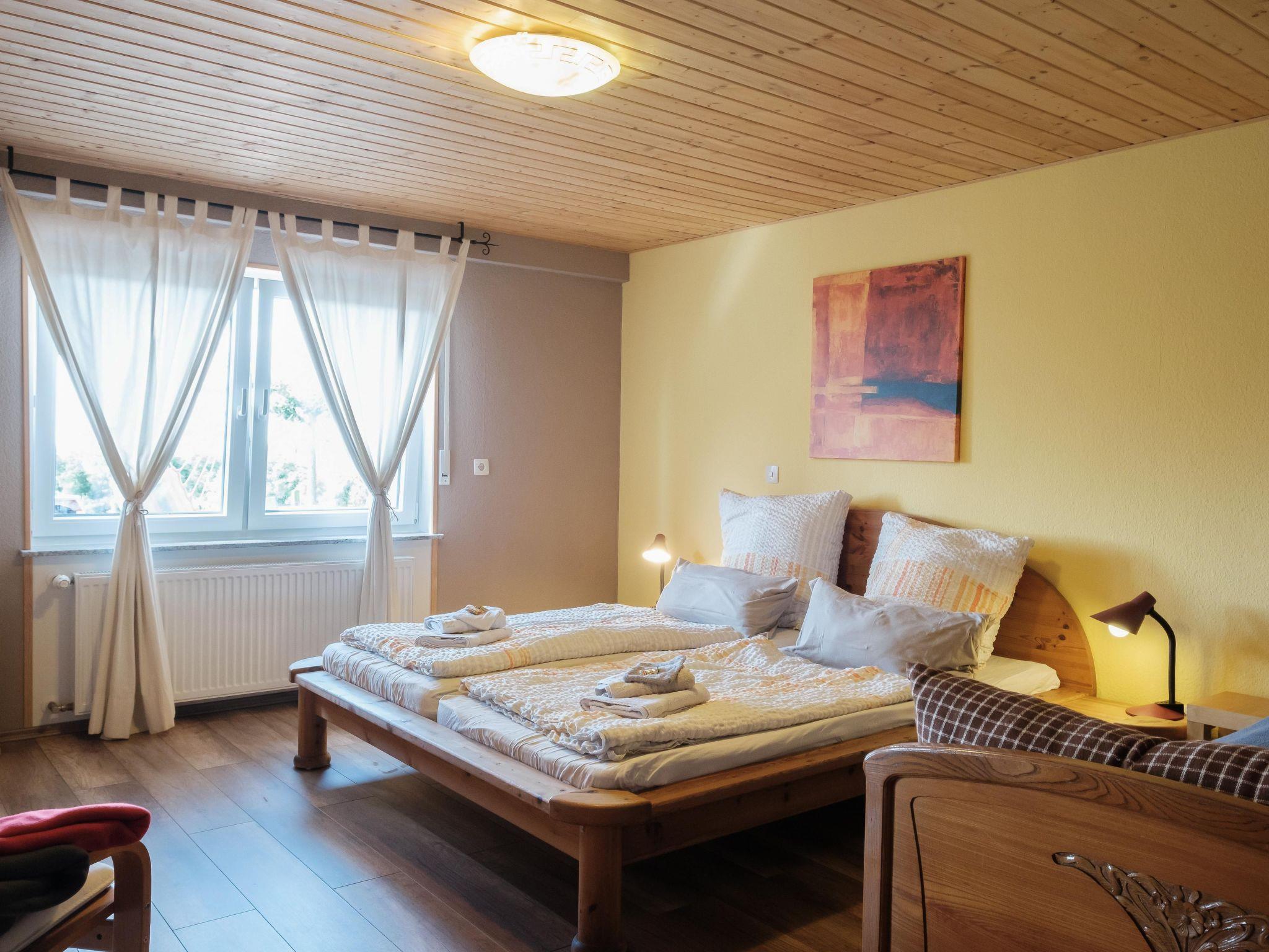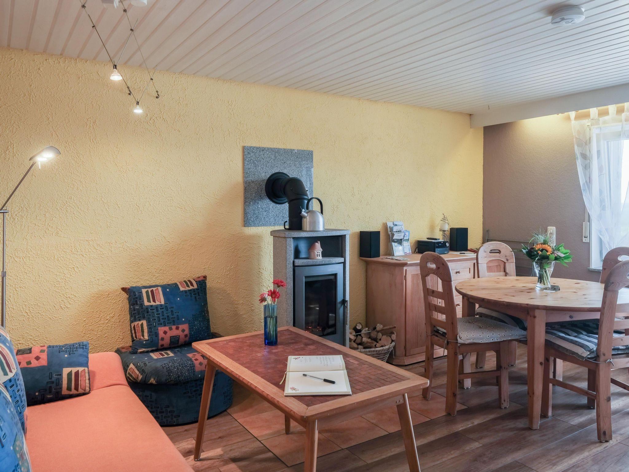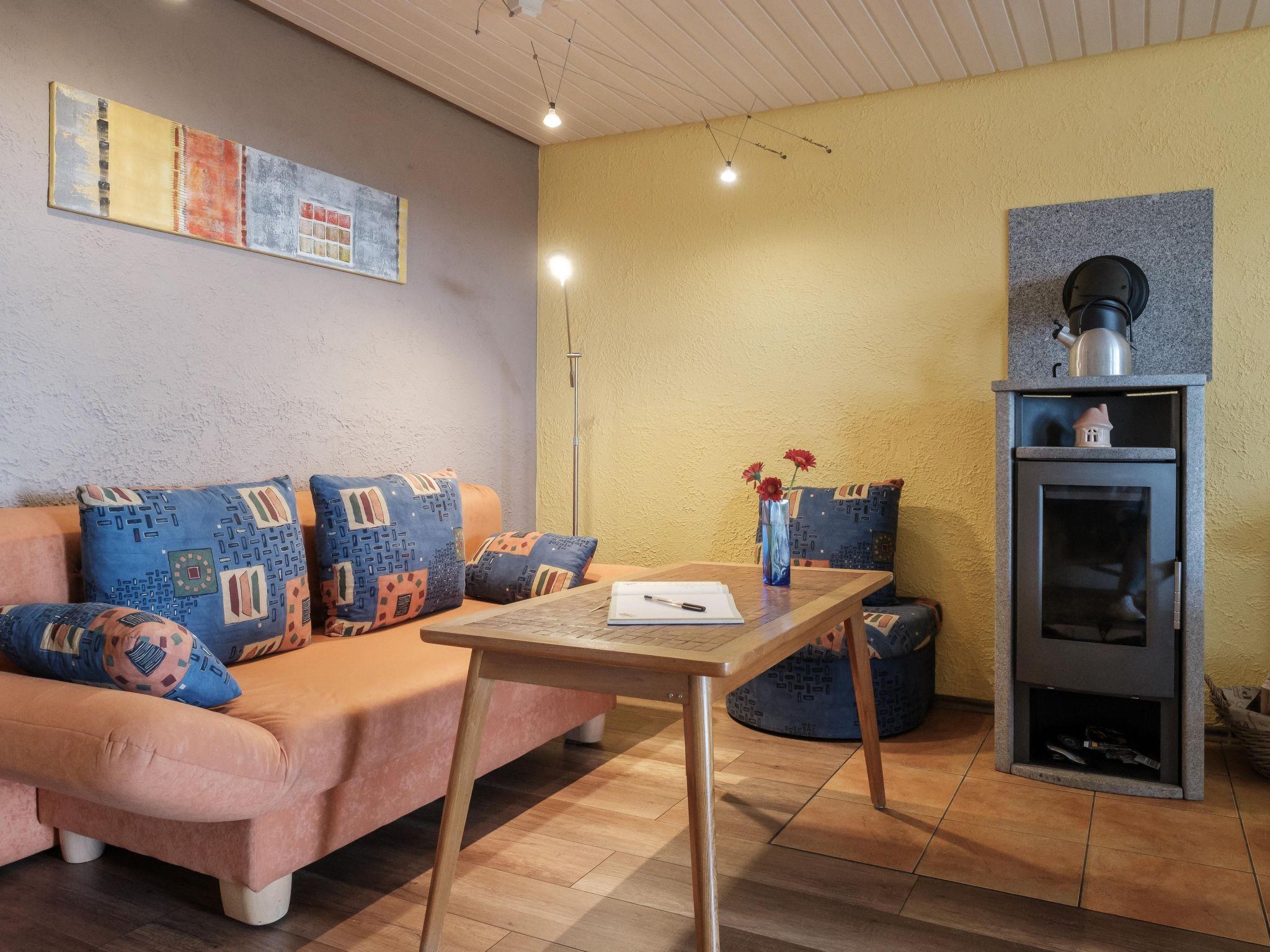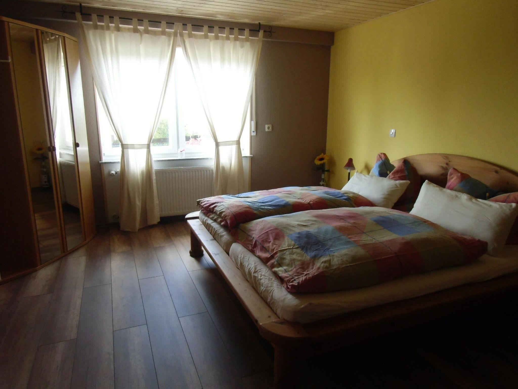 The family-friendly holiday flat is suitable for two to five people, including a maximum of 3 adults. It comprises a bedroom with double bed (180 x 200 cm) and single bed (90 x 200 cm) and possibly an extra bed, a kitchen, a living room with pull-out sofa (150 x 200 cm) and a bathroom with bathtub with shower attachment and WC. The fully equipped kitchen has a fridge with freezer compartment, dishwasher, kettle, coffee machine, toaster, microwave, crockery and cutlery. The flat also has a radio, satellite TV and oil central heating with radiators in all rooms except the kitchen and a wood-burning stove for romantic evenings. Towels, bed linen and table linen are provided. Final cleaning and WLAN are included in the price. Pets are allowed on request for a fee.