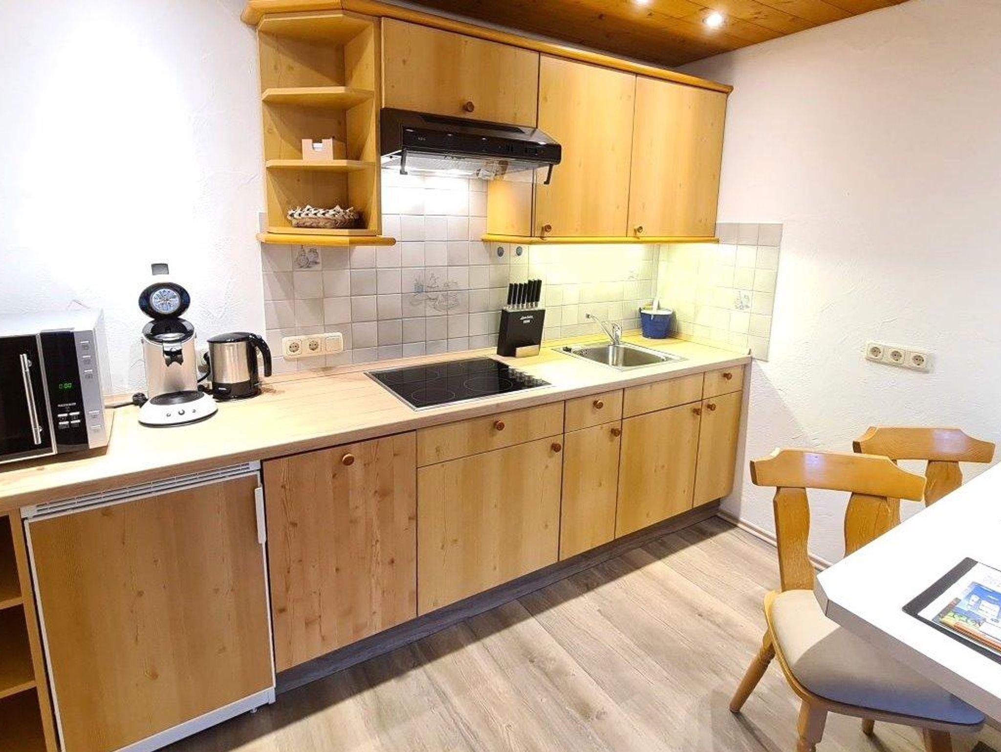 Die Küchenzeile enthält eine Senseo Kaffeepadmaschine, eine Spülmaschine, ein 4-Platten Cerankochfeld, einen Wasserkocher, einen Toaster, eine Mikrowelle sowie Ess- und Kochgeschirr..